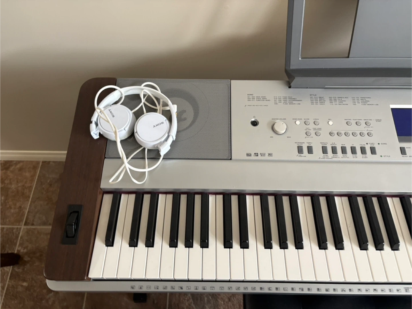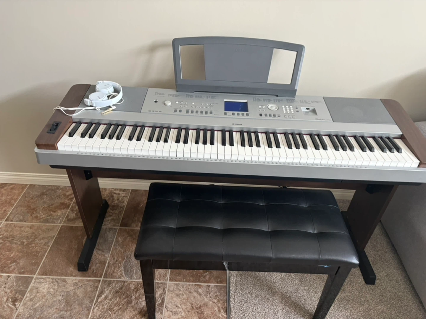 Yamaha digital piano with a dark wood finish. Includes a black cushioned bench and a pair of white Sony headphones. Stand for sheet music is also included.