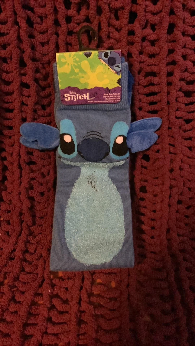 Comfortable blue Stitch socks featuring the character's face and ears. Shoe size is 4-10. Made in China.