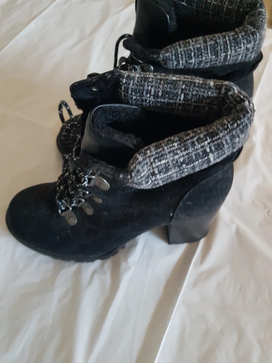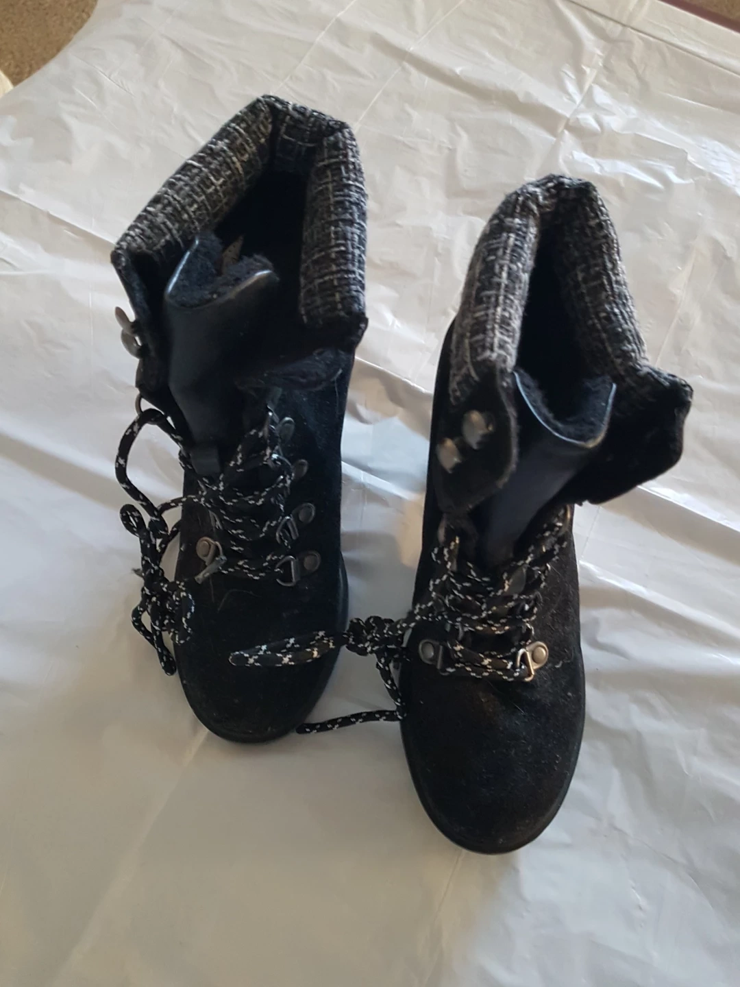 Black suede-like boots from Spring Step. These feature a chunky heel and lace-up front with a cosy knitted cuff. Boots are US size 6, EUR 36, UK 3.