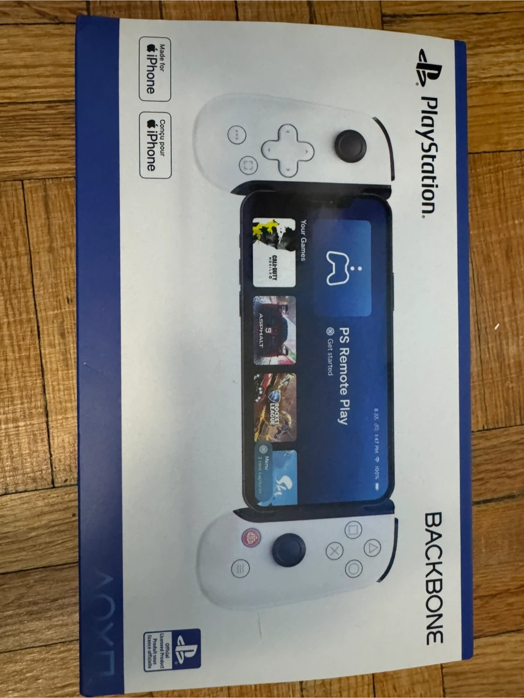 This is the PlayStation Backbone controller designed for iPhones. It's compatible with PS Remote Play for a seamless gaming experience. Snap it in and start gaming on the go!