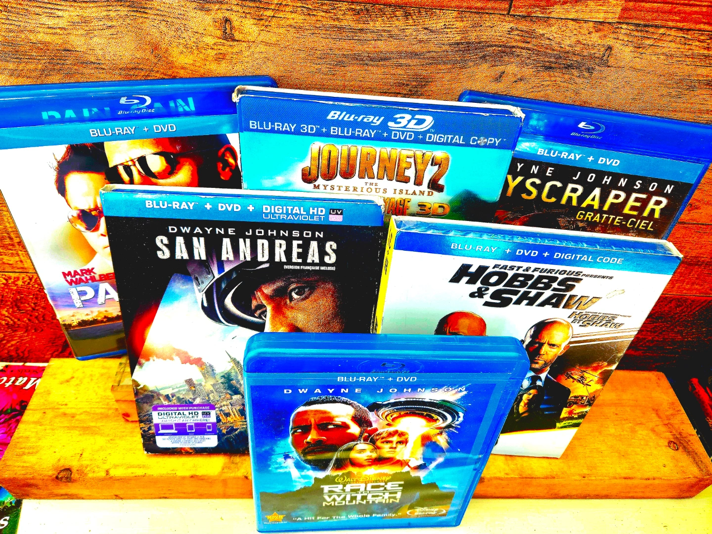 Bundle of Blu-ray movies featuring Dwayne Johnson. Includes San Andreas, Journey 2, Skyscraper, and Race to Witch Mountain. Also includes Hobbs & Shaw and Pain & Gain.