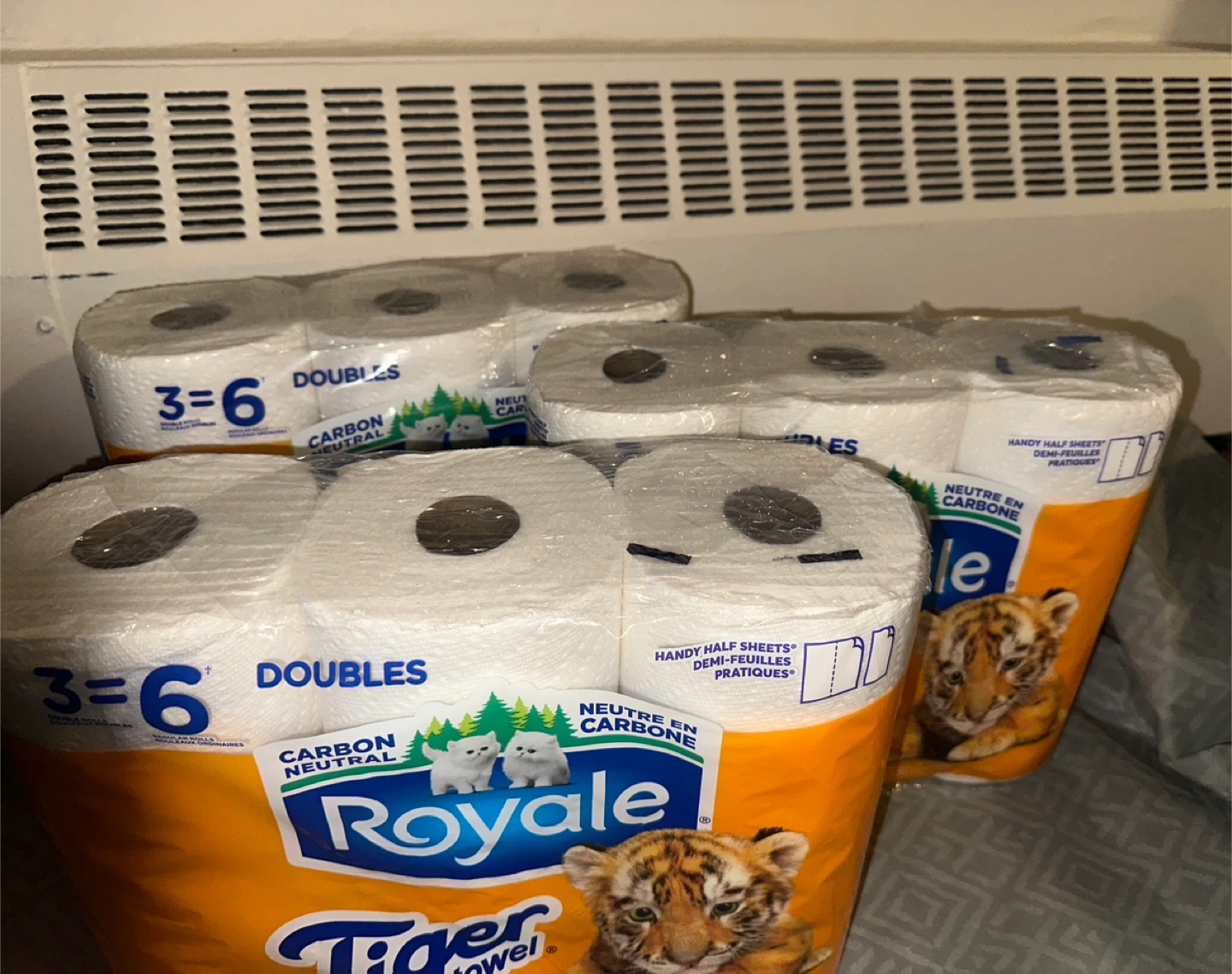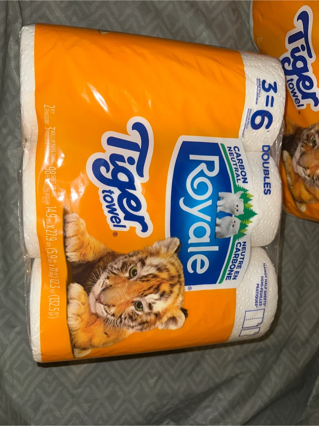 All three packs are for 5 This is a 6-pack of Royale Tiger Towel paper towels. They're double rolls, so each pack is equivalent to 6 regular rolls. Carbon neutral product.