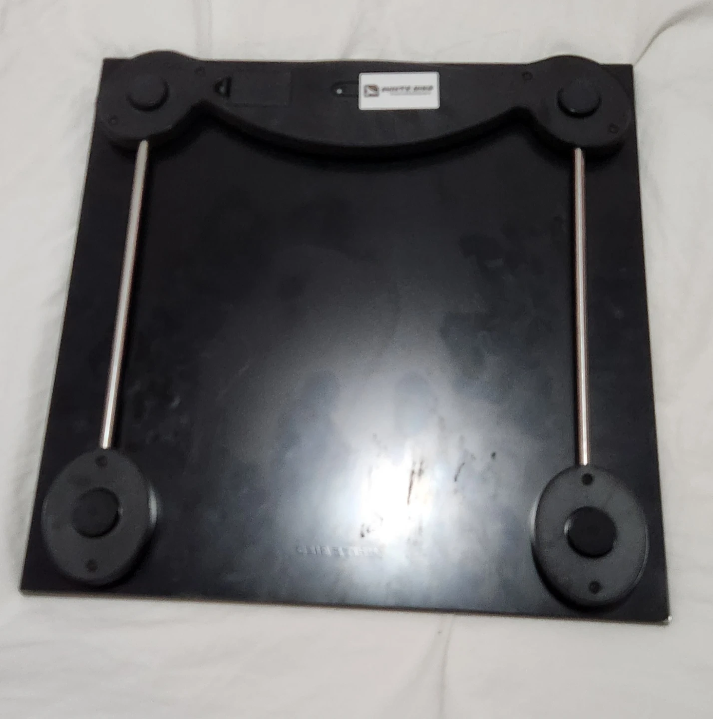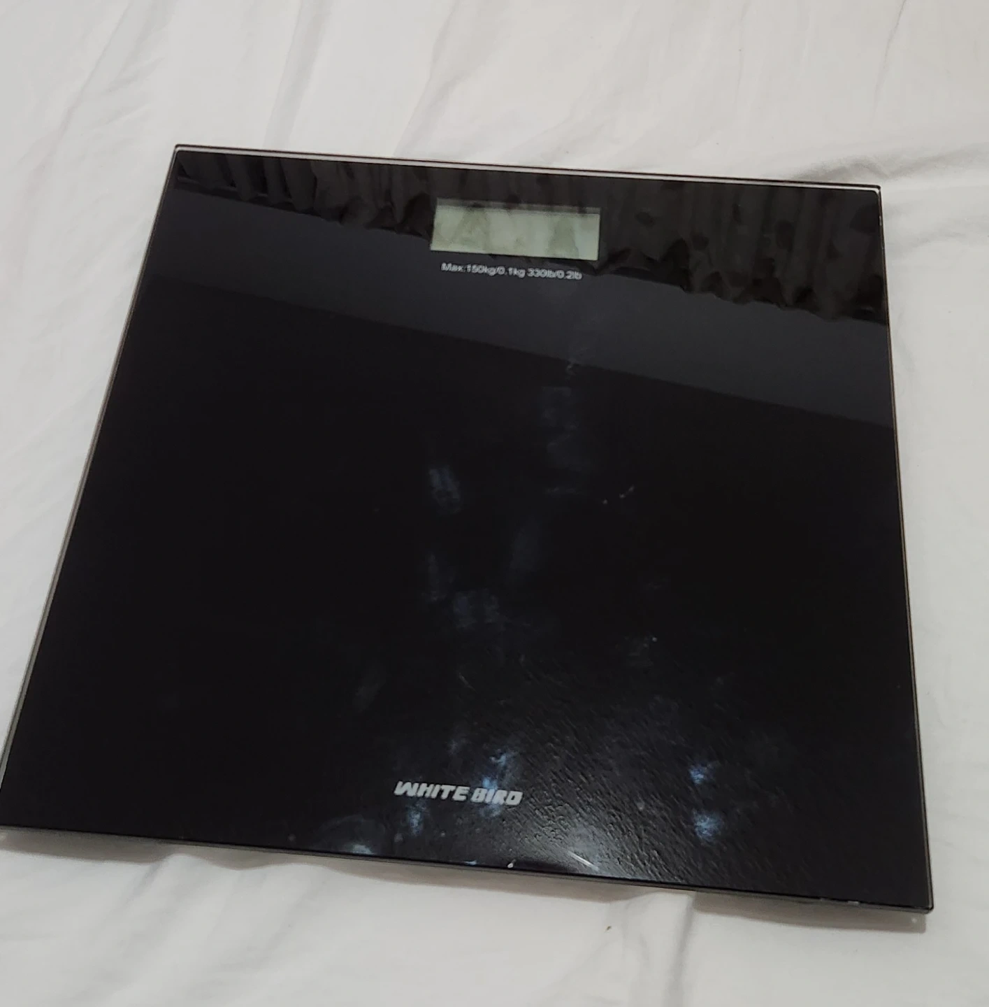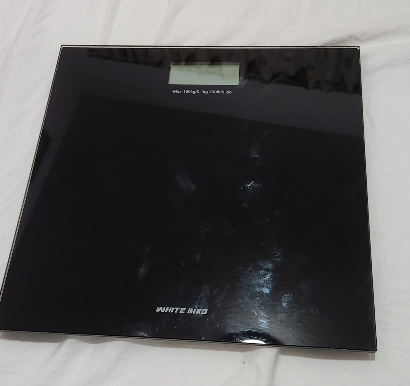 White Bird digital scale with a maximum capacity of 150kg or 330lb. It's made of glass and has a sleek black finish. This scale is useful for tracking your weight daily.