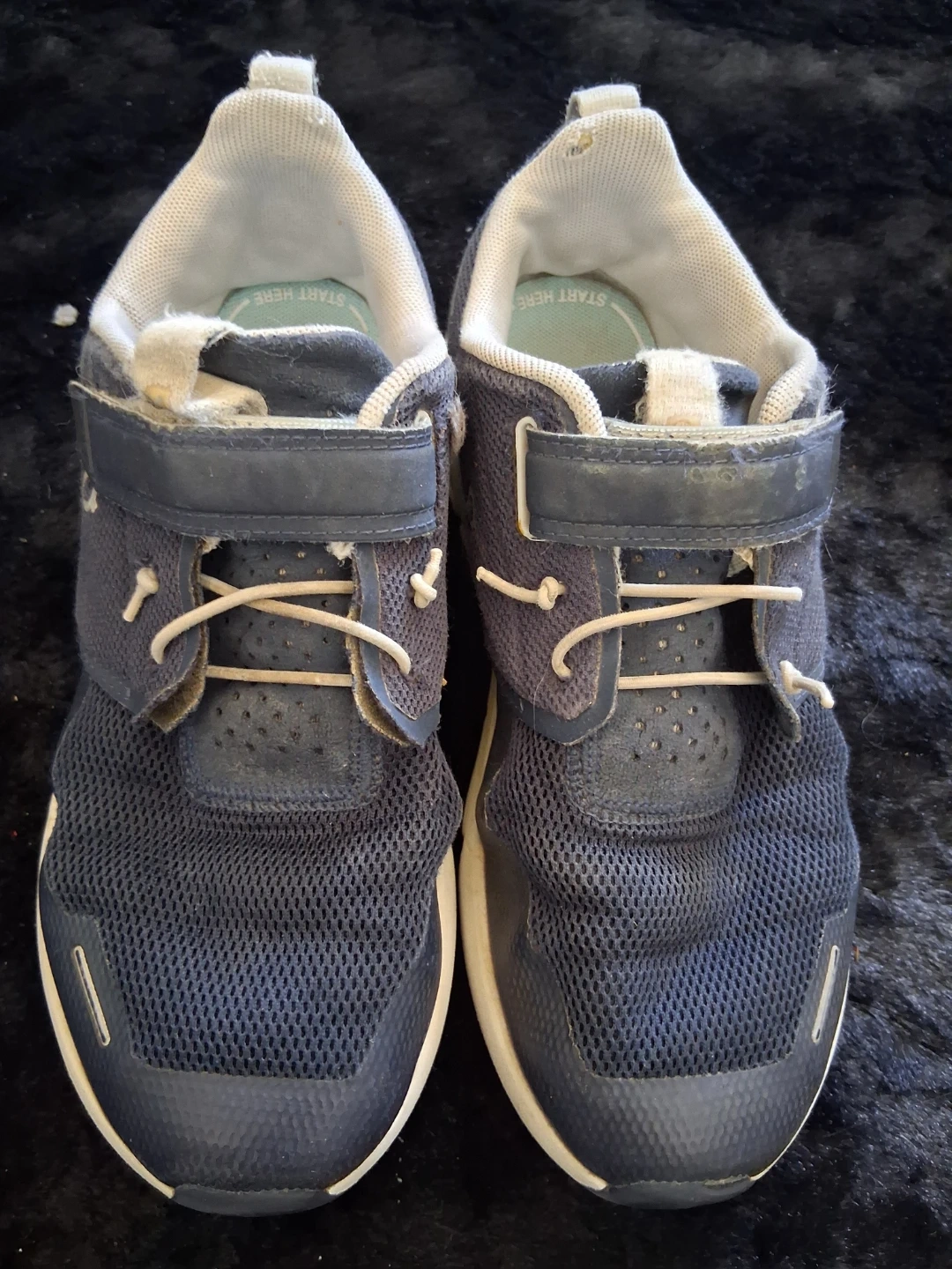 These kids' On Running shoes are in navy blue with a mesh upper. They feature elastic laces and a hook-and-loop strap for easy on and off. Rubber sole with "CloudTec" engineering. Size