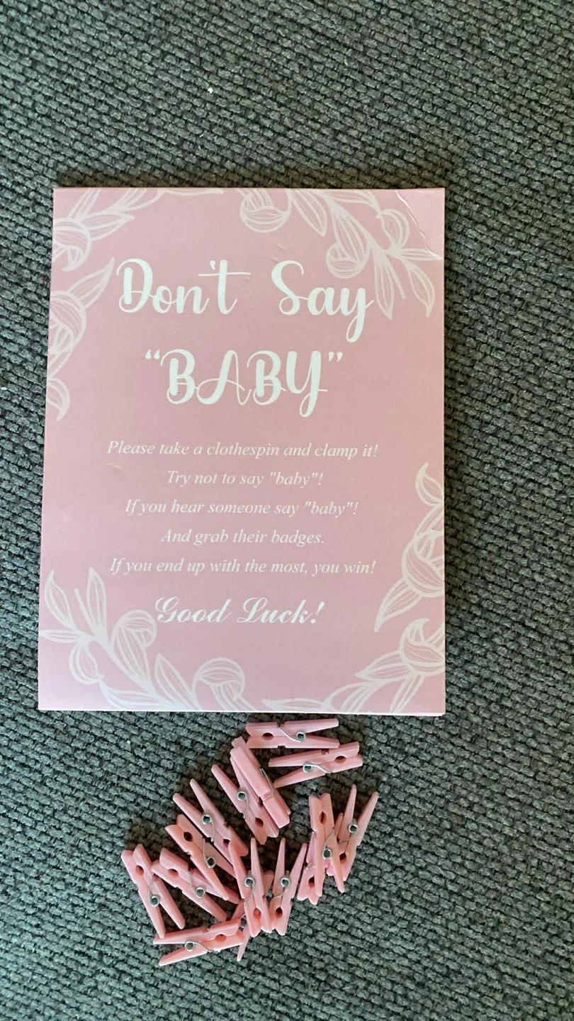 This is a fun 'Don't Say Baby' game set for a baby shower! It includes a sign with game instructions and numerous pink clothespins. Guests take a clothespin and try not to say 'baby' during the event. The person with the most clothespins at the end wins!