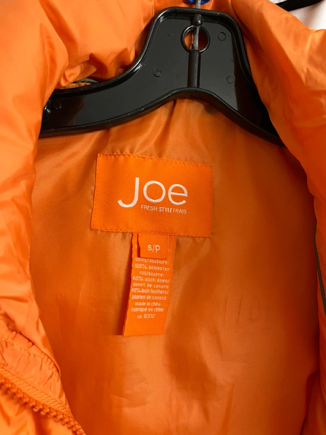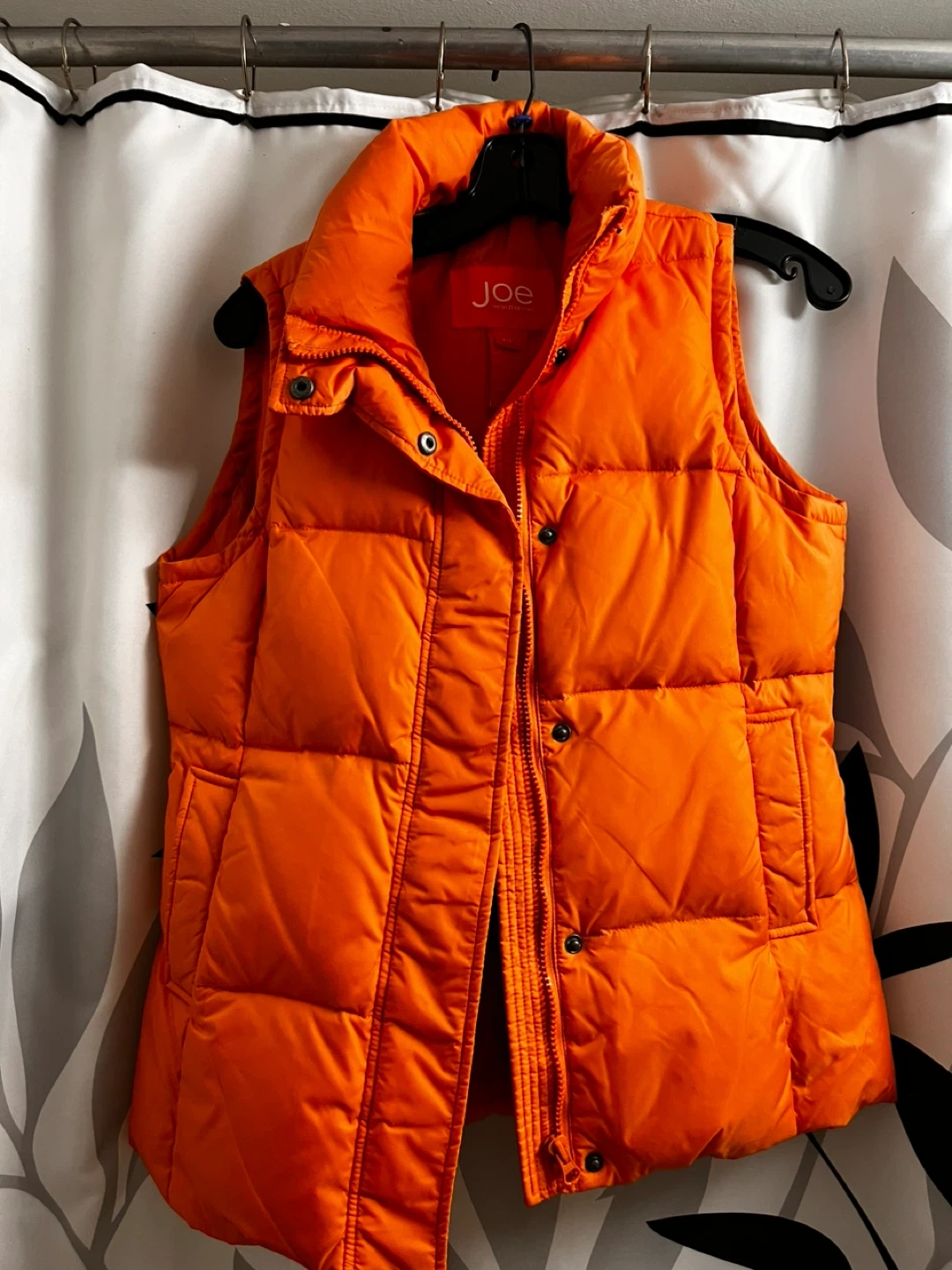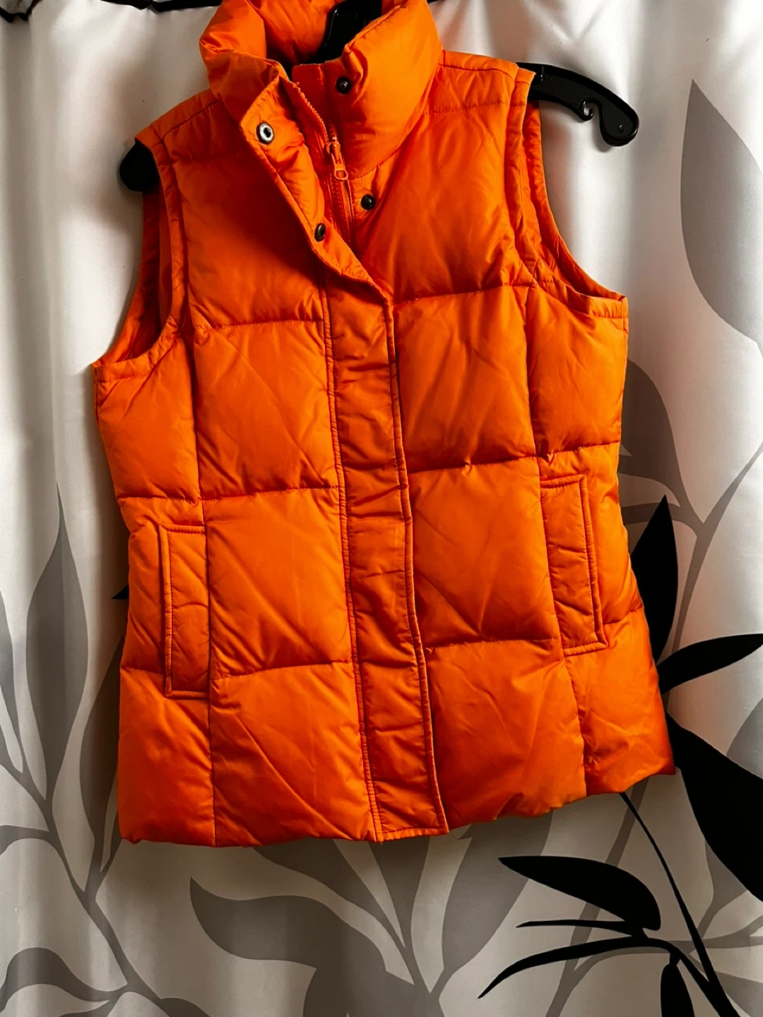 This Joe Fresh puffer vest is a bright orange colour. It's a size S/P. The lining is 100% polyester and the fill is 60% down and 40% waterfowl feathers. It's great for layering when it's cool out! Worn only once.