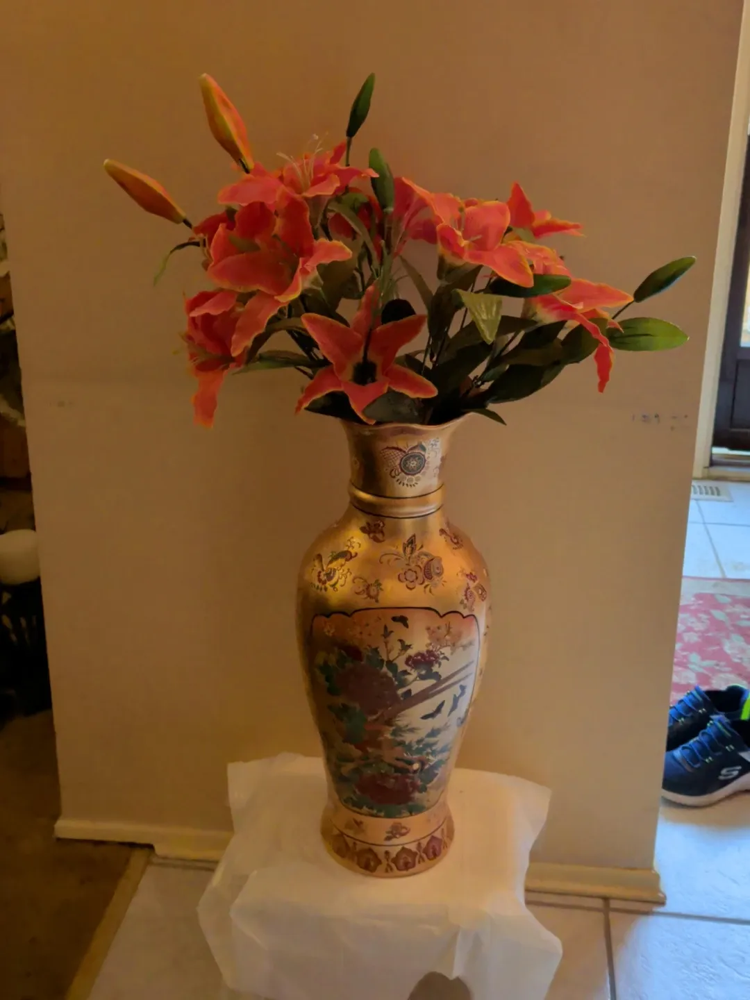This is a beautiful decorative vase with an intricate gold finish and detailed floral and bird motifs. It comes with a bouquet of artificial orange lilies. This vase adds a touch of elegance to any room.