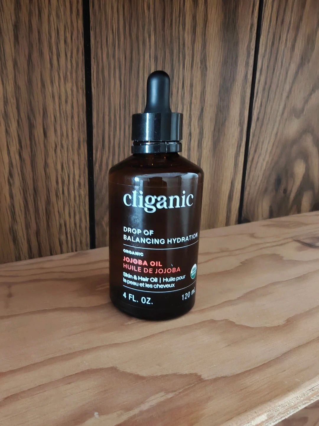 This is Cliganic Organic Jojoba Oil, a drop of balancing hydration for skin and hair. It's 4 fl. oz. or 120 ml. This oil is great for moisturizing and conditioning. You'd use this for daily skincare or hair treatments.