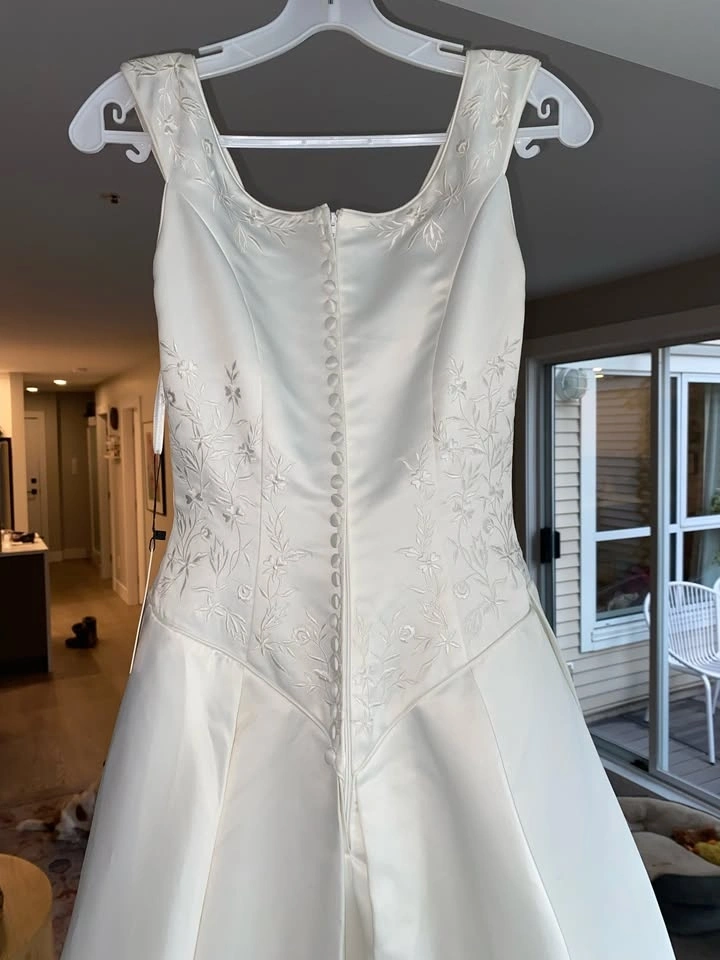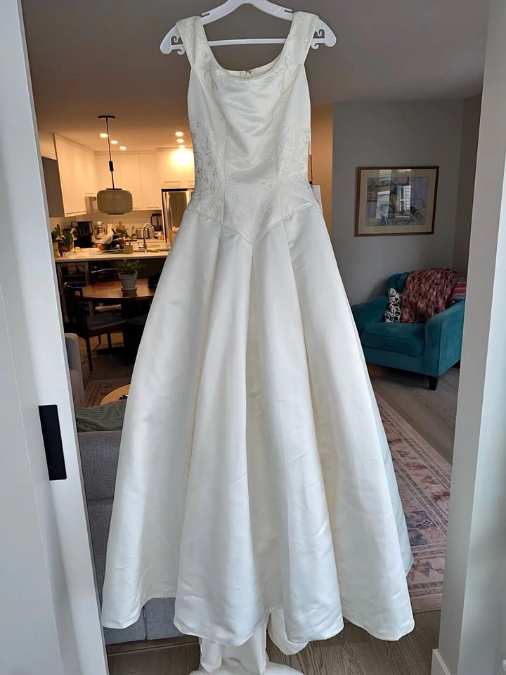 Selling a classic silhouette boat neck wedding dress with a super flattering Basque waist. This was bought off-the-rack and has never been worn (except to try on) and is unaltered. Since it's off-the-rack, it will need dry-cleaning, but it's in perfect, brand-new condition aside from what's expected from being in a shop (no snags, rips, or damage to the fabric).