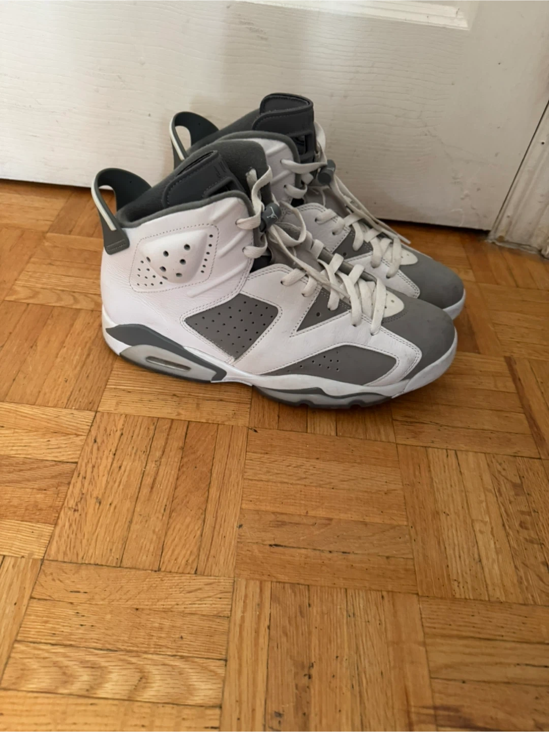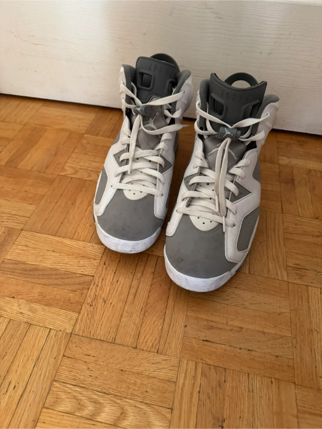 Air Jordan 6 Retro "Cool Grey" sneakers. These kicks feature a crisp white and cool grey colourway. They're comfy and stylish, perfect for everyday wear.
