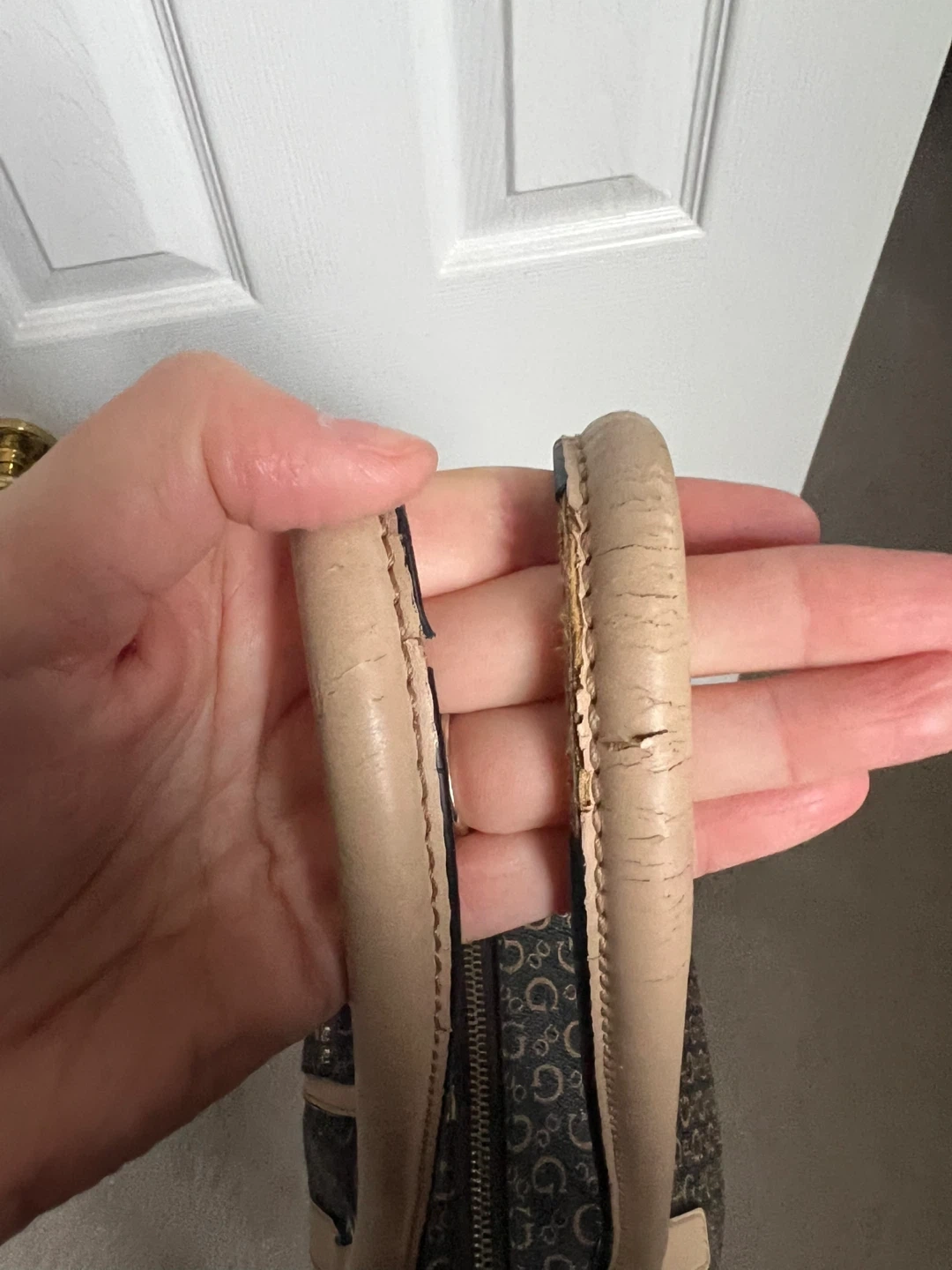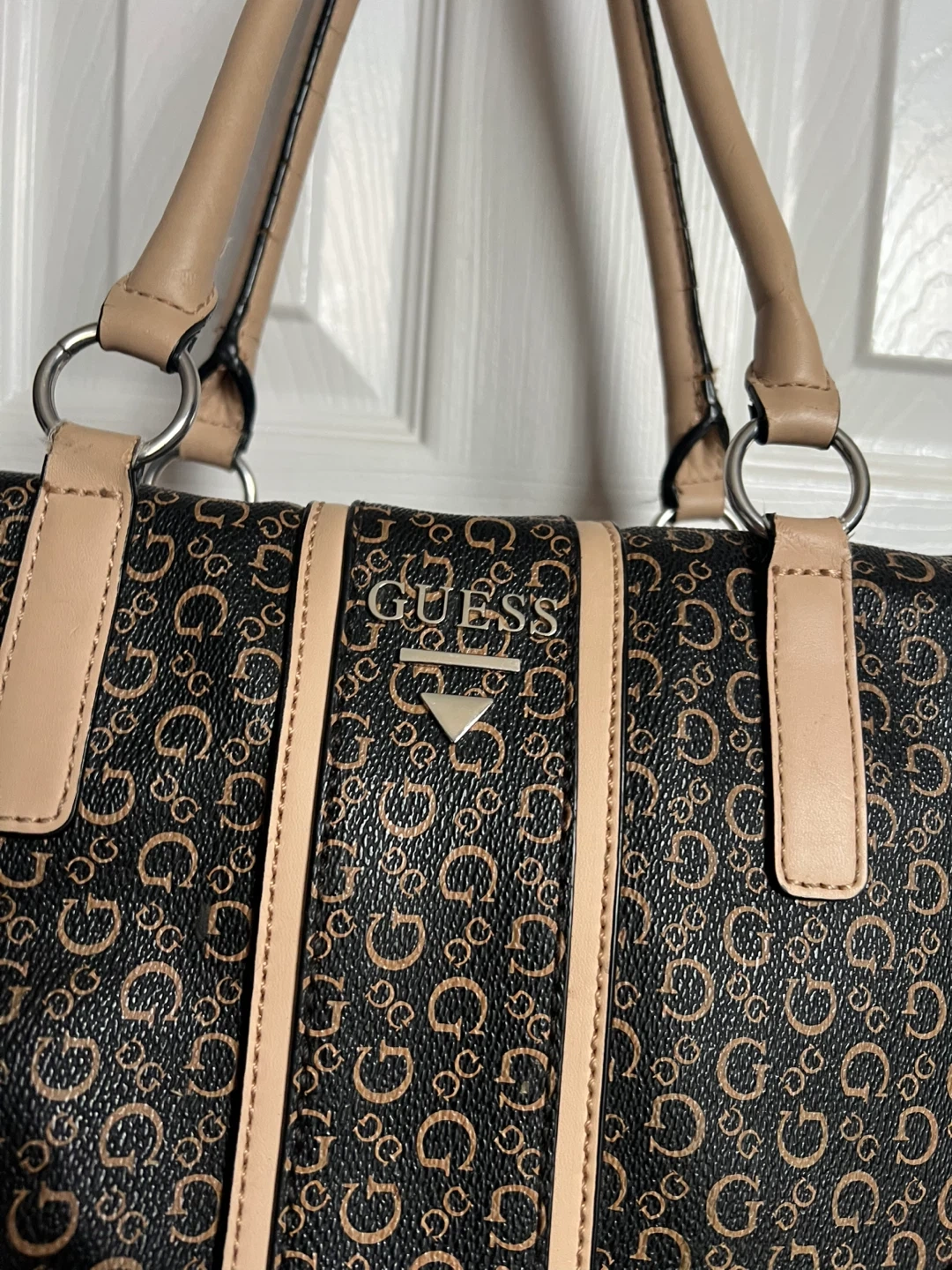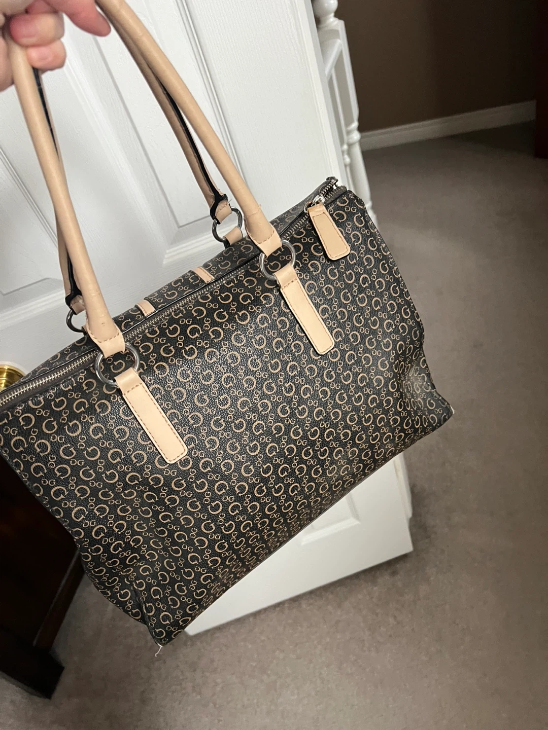 This Guess tote bag features a classic monogram pattern. It has dual top handles and a zip closure for security. Some wear is visible on the handle edges.