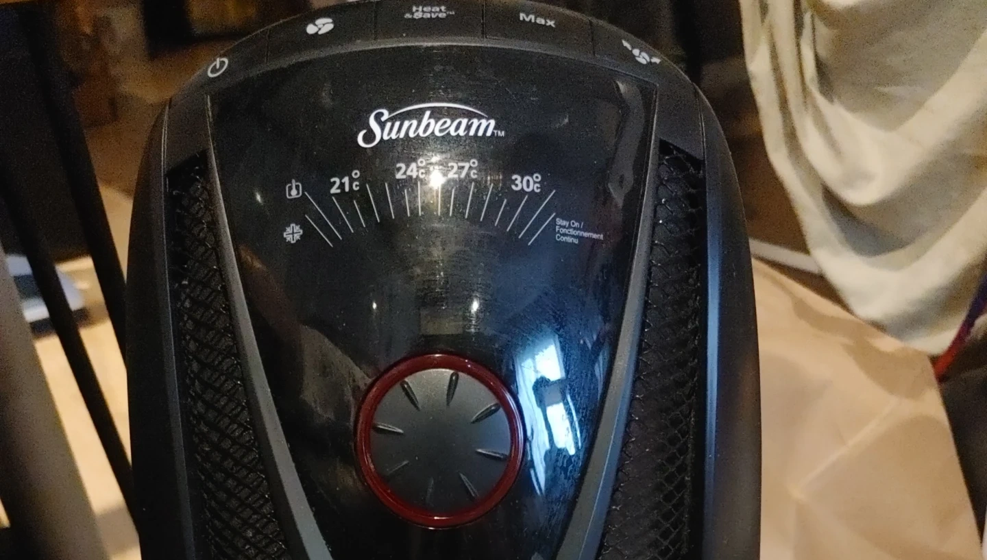 This is a Sunbeam heater with adjustable temperature settings from 21°C to 30°C. It has a 'Heat & Save' mode and a 'Stay On/Fonctionnement Continu' setting. This heater is perfect for keeping any room comfortably warm during colder months.