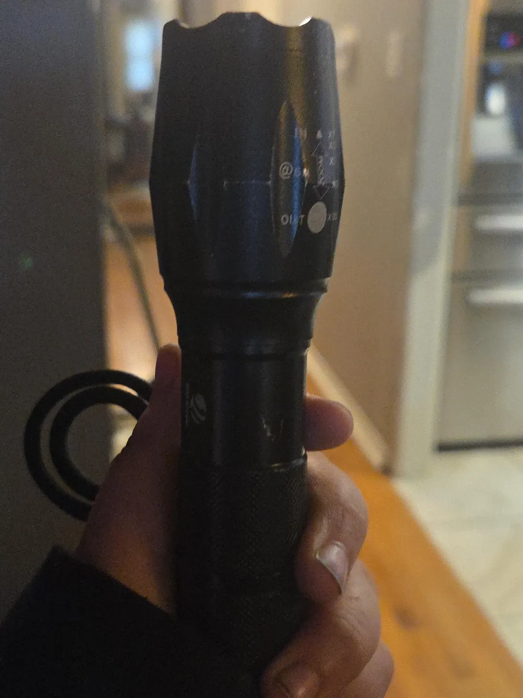 This is a black aluminum flashlight. It features adjustable zoom and multiple light modes. Great for outdoor activities or emergencies!