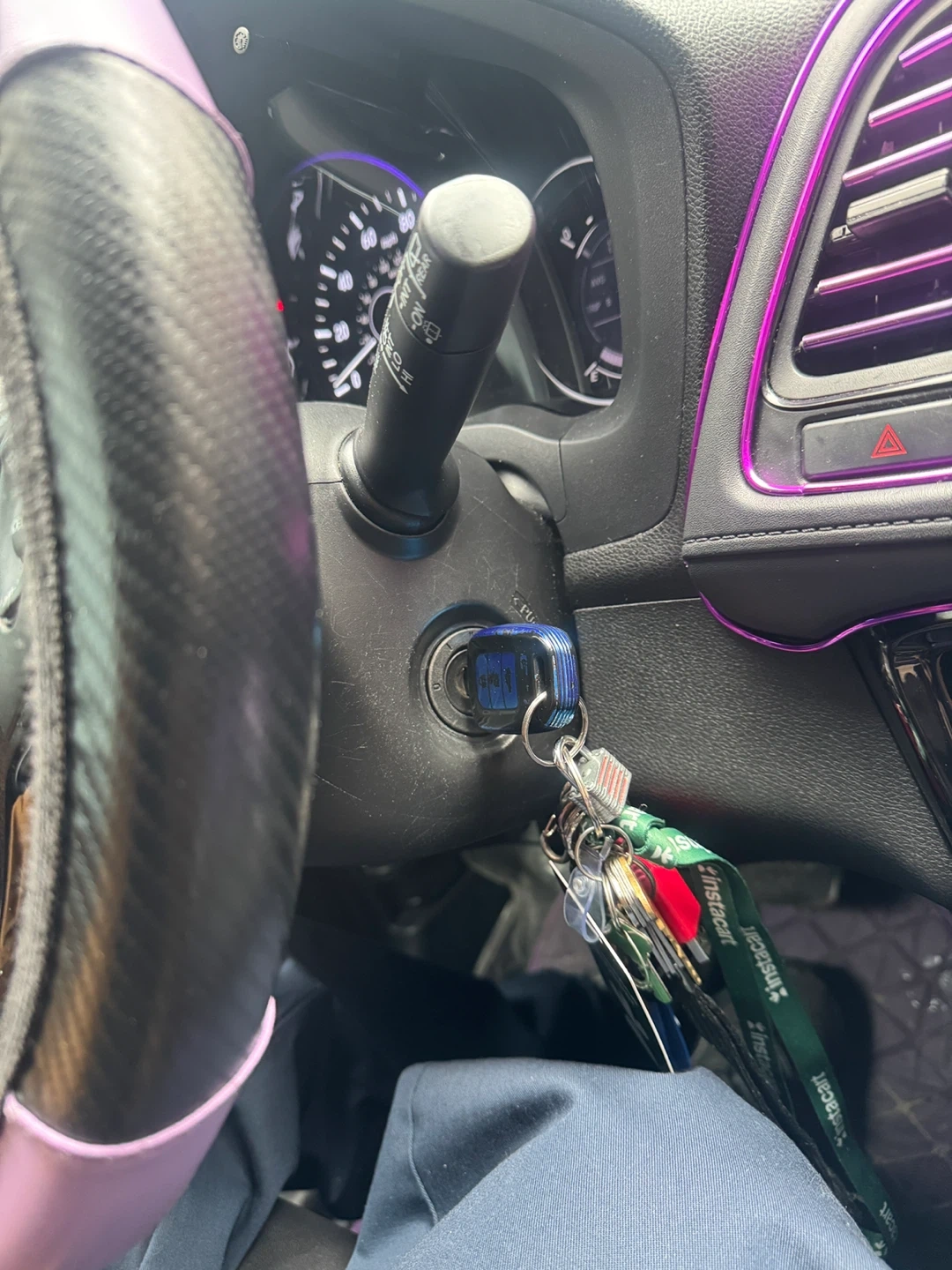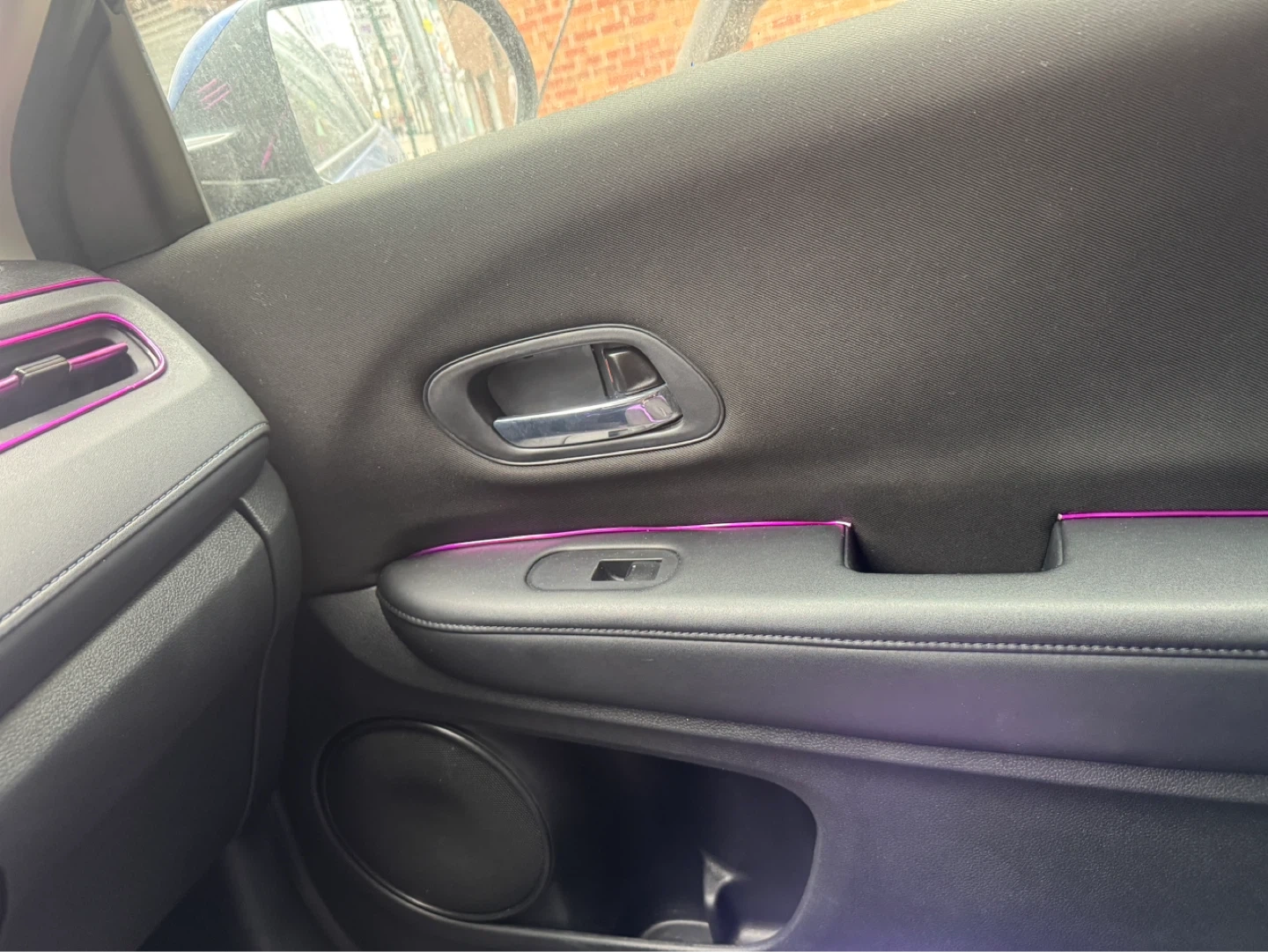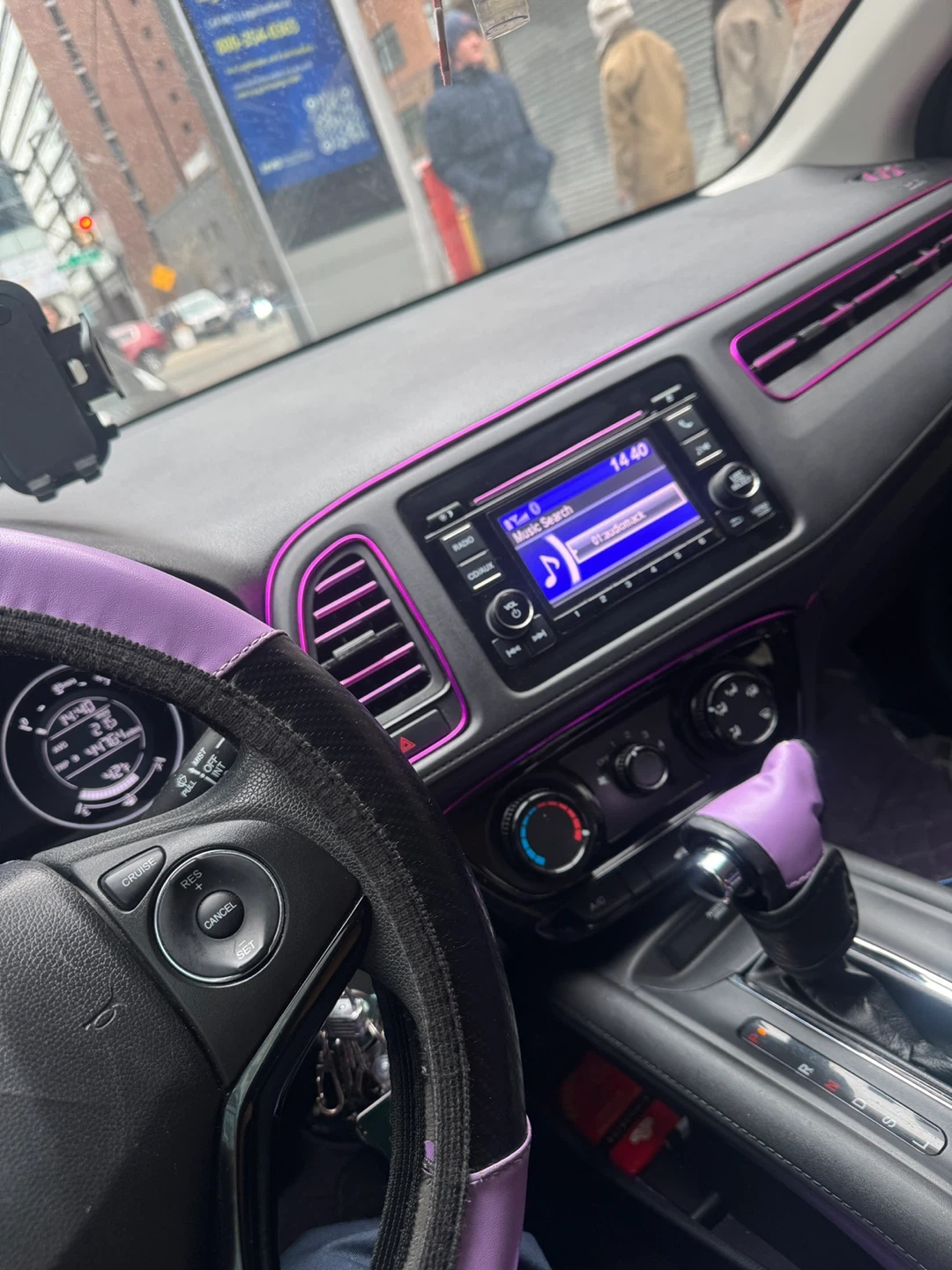 This is a blue 2018 Honda HR-V. It has a standard infotainment system with music search functionality. The interior features ambient purple lighting.