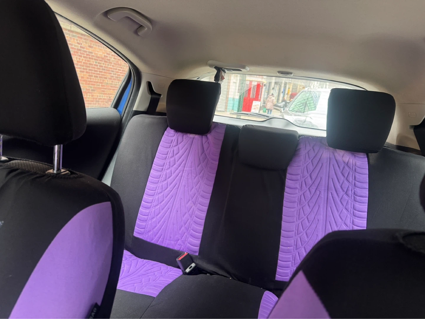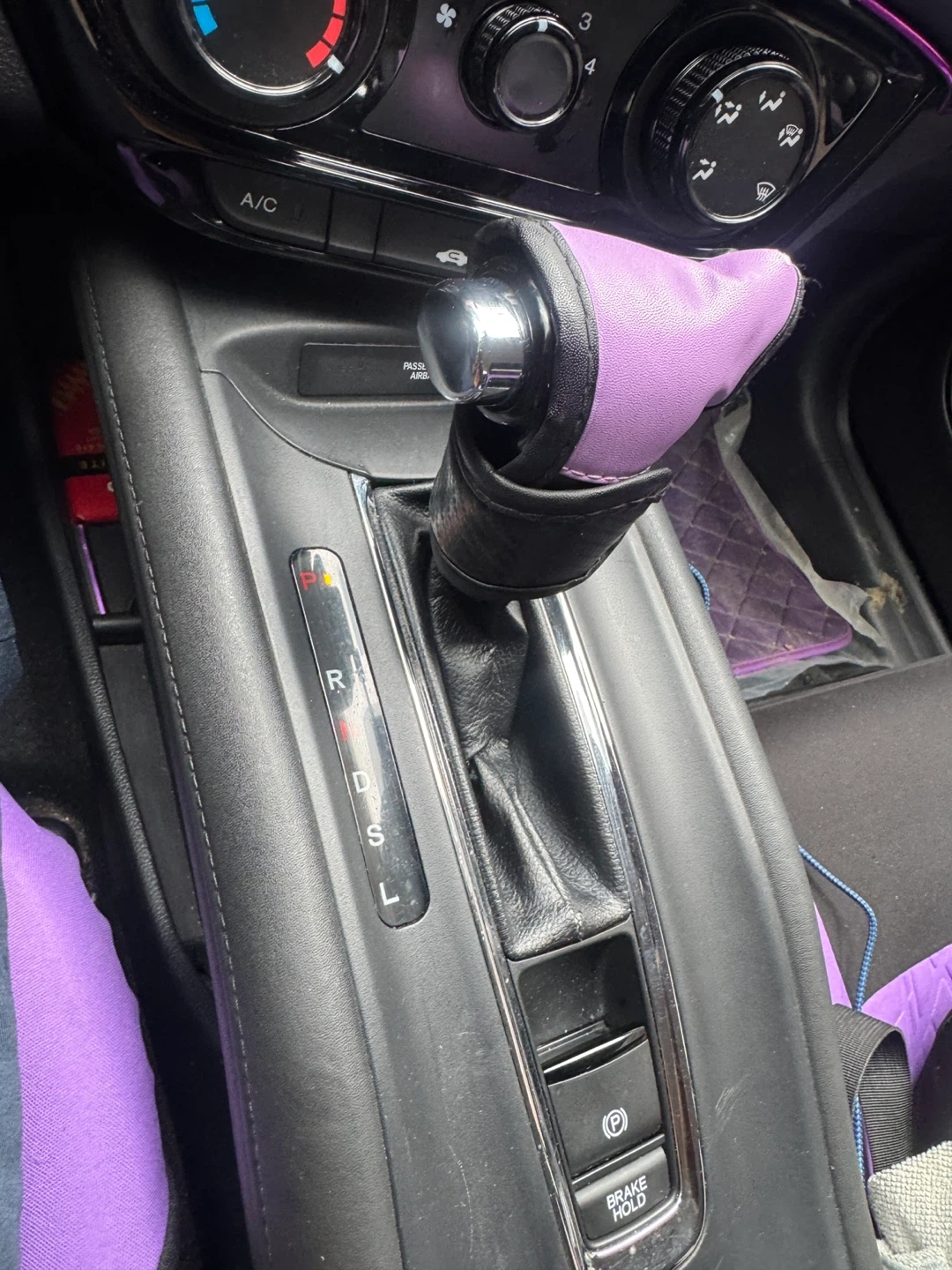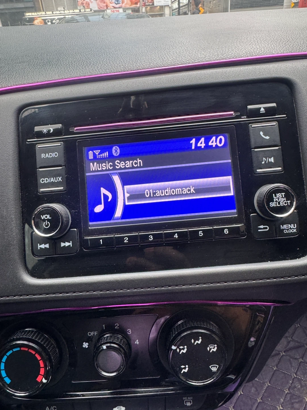 This is a blue 2018 Honda HR-V. It has a standard infotainment system with music search functionality. The interior features ambient purple lighting.