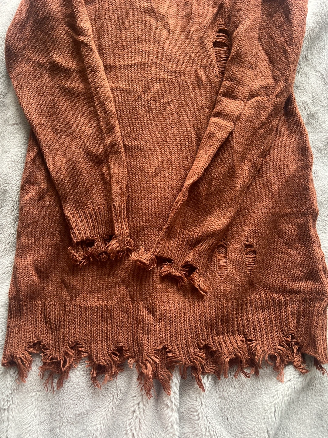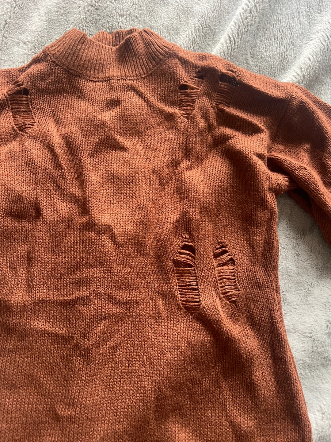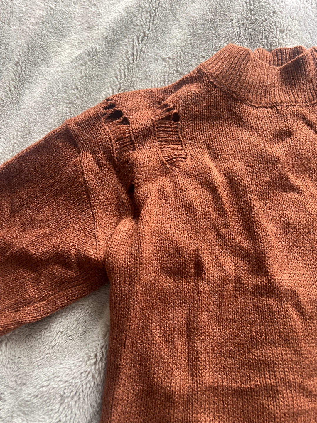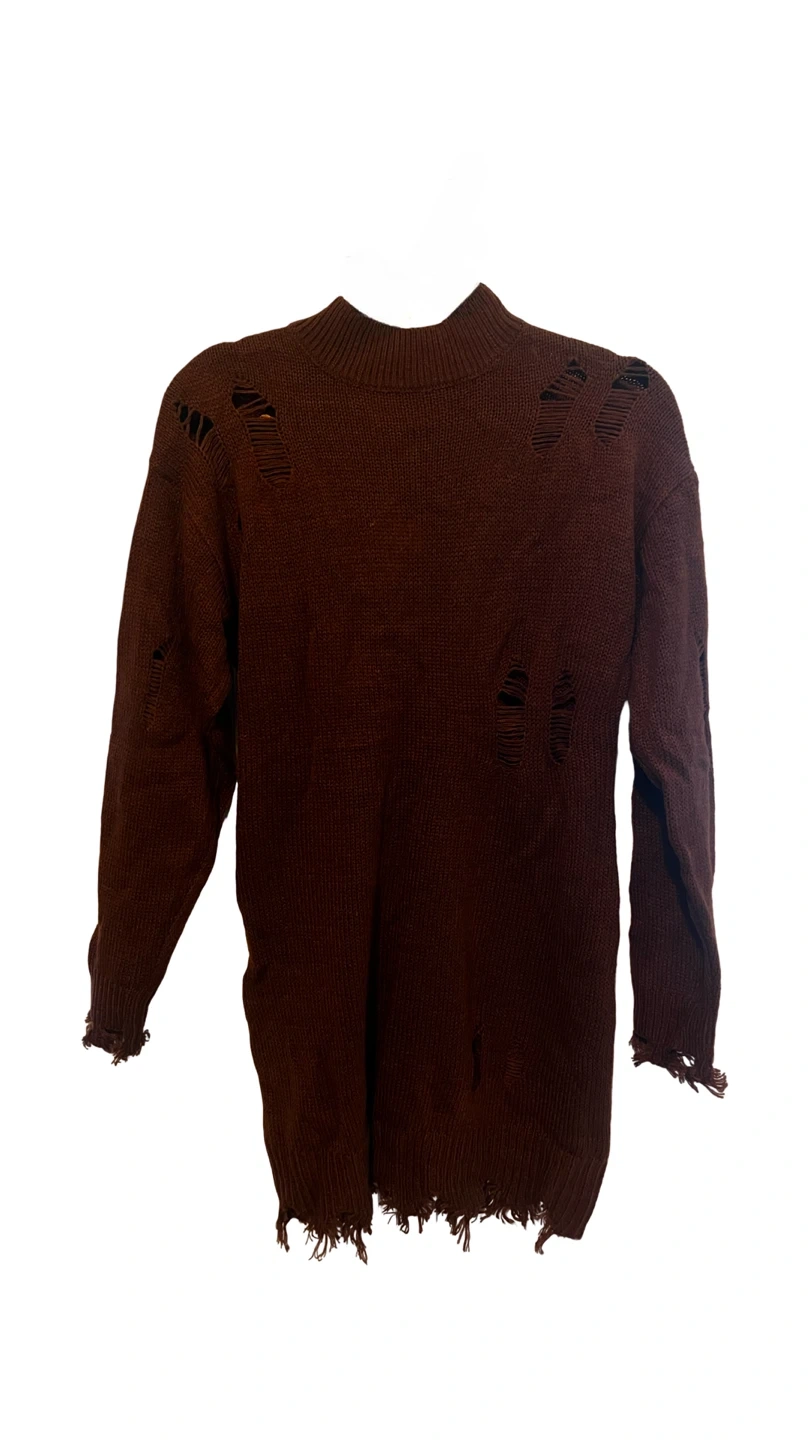 Cozy knit sweater with a mock neck. Features distressed detailing on the sleeves and hem for a edgy look. This sweater's relaxed fit makes it comfortable for everyday wear.
