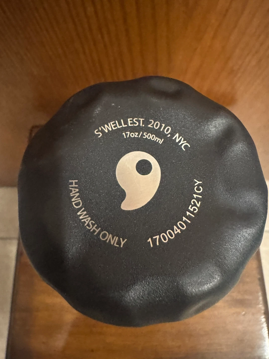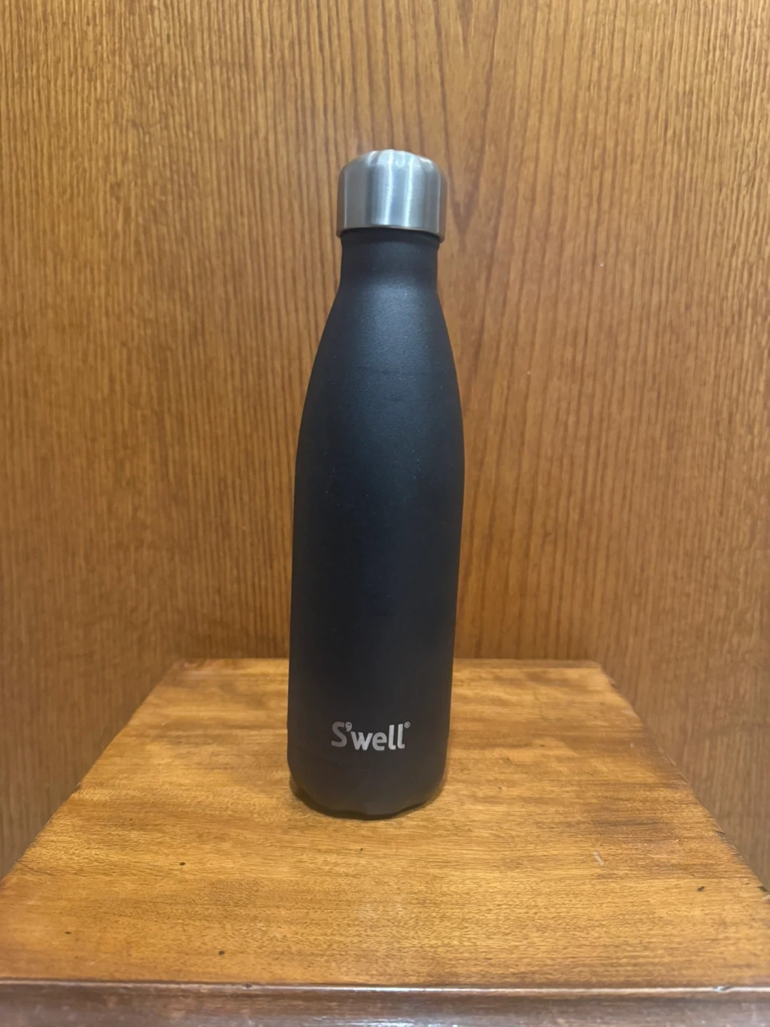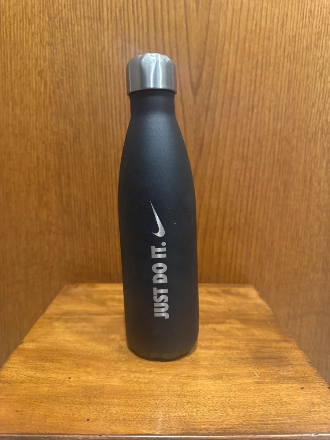 This is a black S'well insulated water bottle. Branded with Nike ‘Just Do It.’ It holds 17oz or 500ml. Bottom has some signs of deformation.