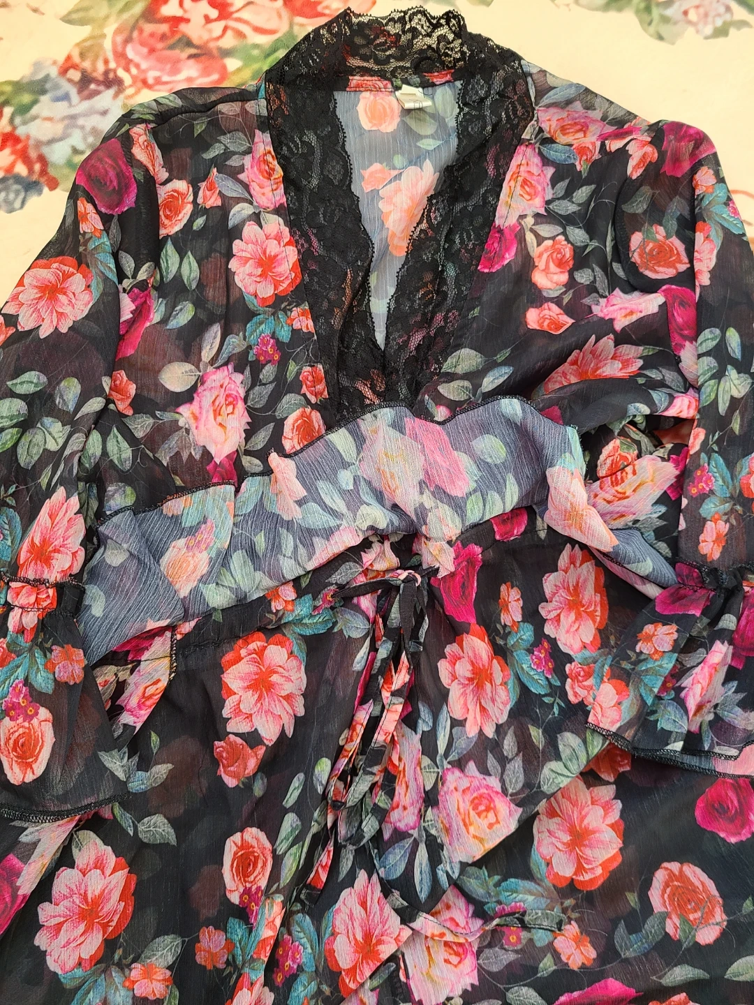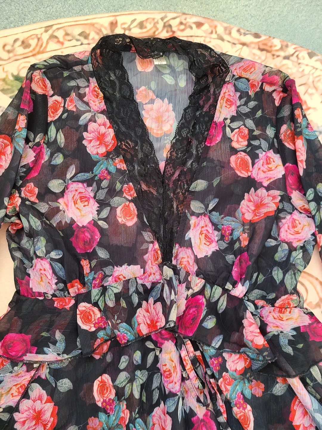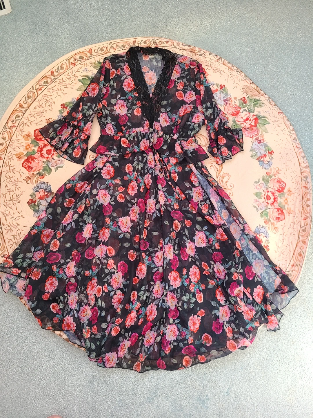 Beautiful floral midi dress. Features a V-neck with black lace trim, three-quarter sleeves with ruffle detailing, and a string to tie at the waistline. Sheer fabric with a dark background and colourful floral print. Lightweight and flowy.