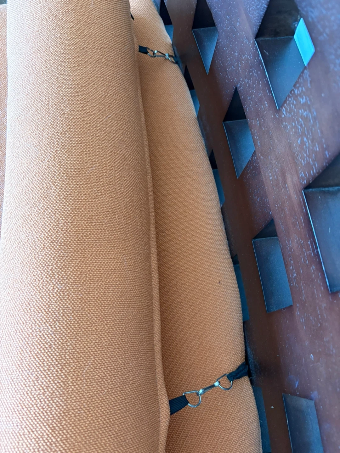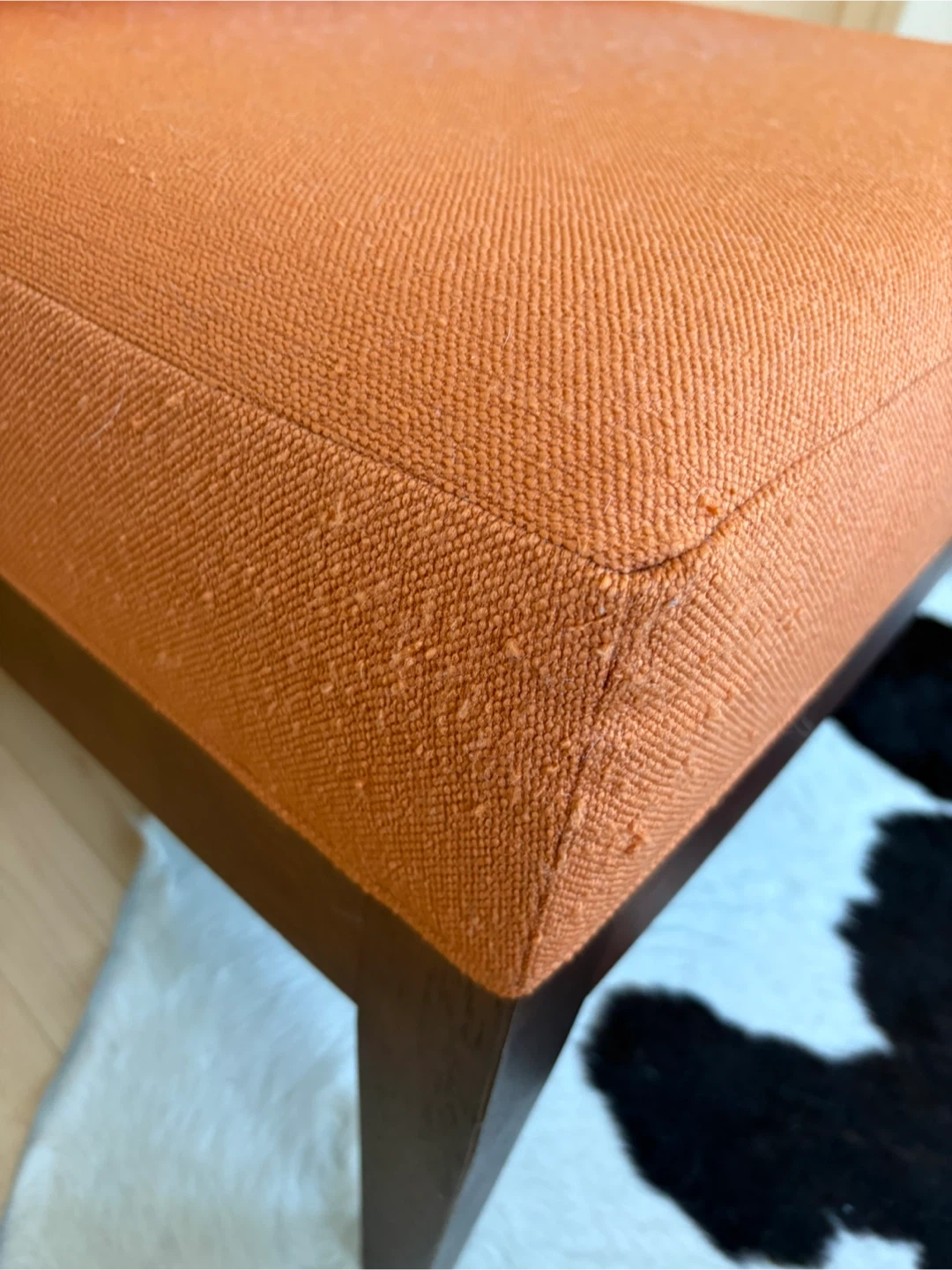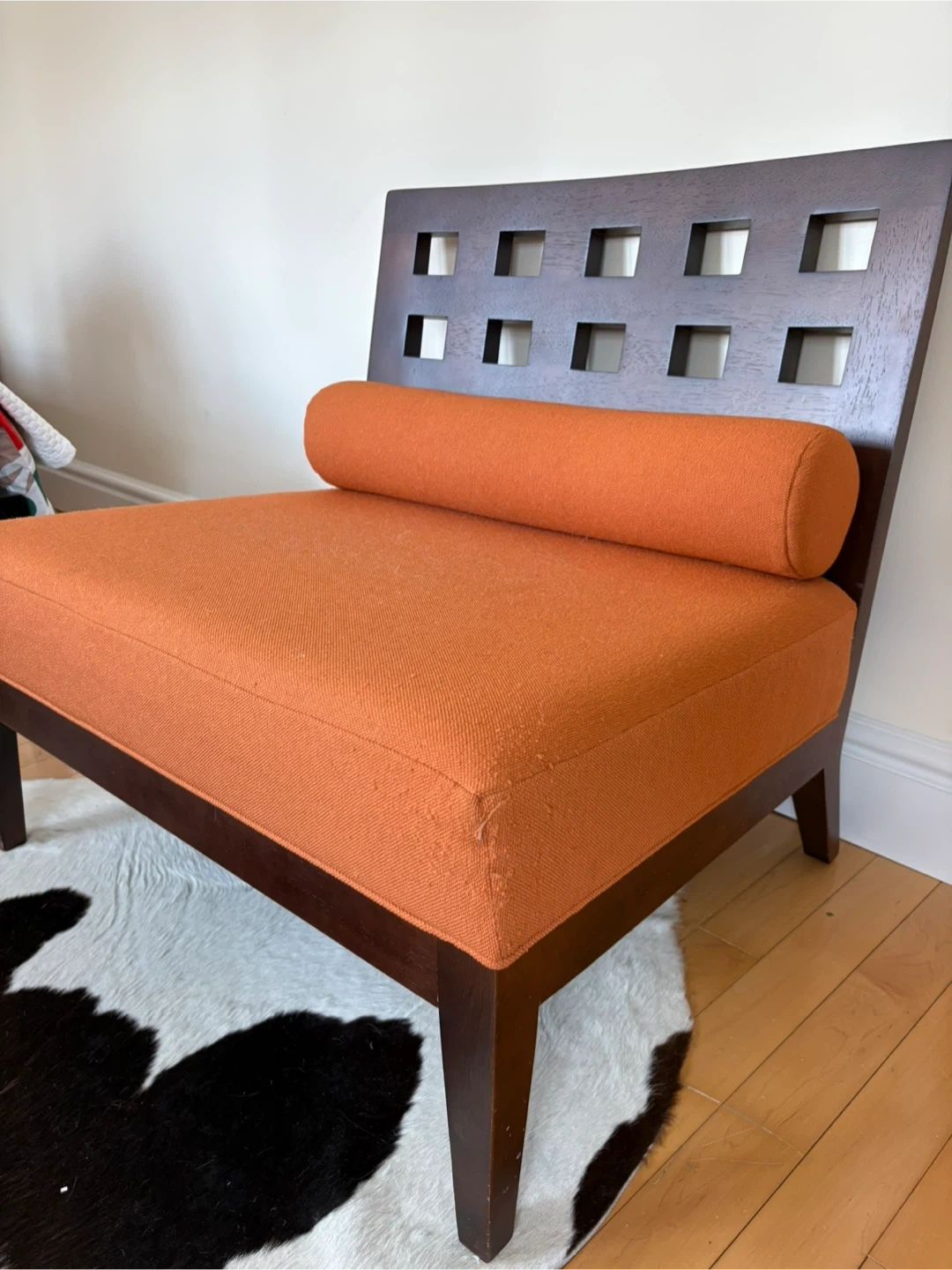 Accent chair featuring dark solid wood frame and vibrant orange fabric upholstery. It includes a removable cylindrical bolster pillow for added comfort. The backrest has a stylish open square pattern. It’s definitely been slept on by my cat, as well as a little scratched on the fabric corners. Still in great shape, and would be magnificent for re-upholstering!