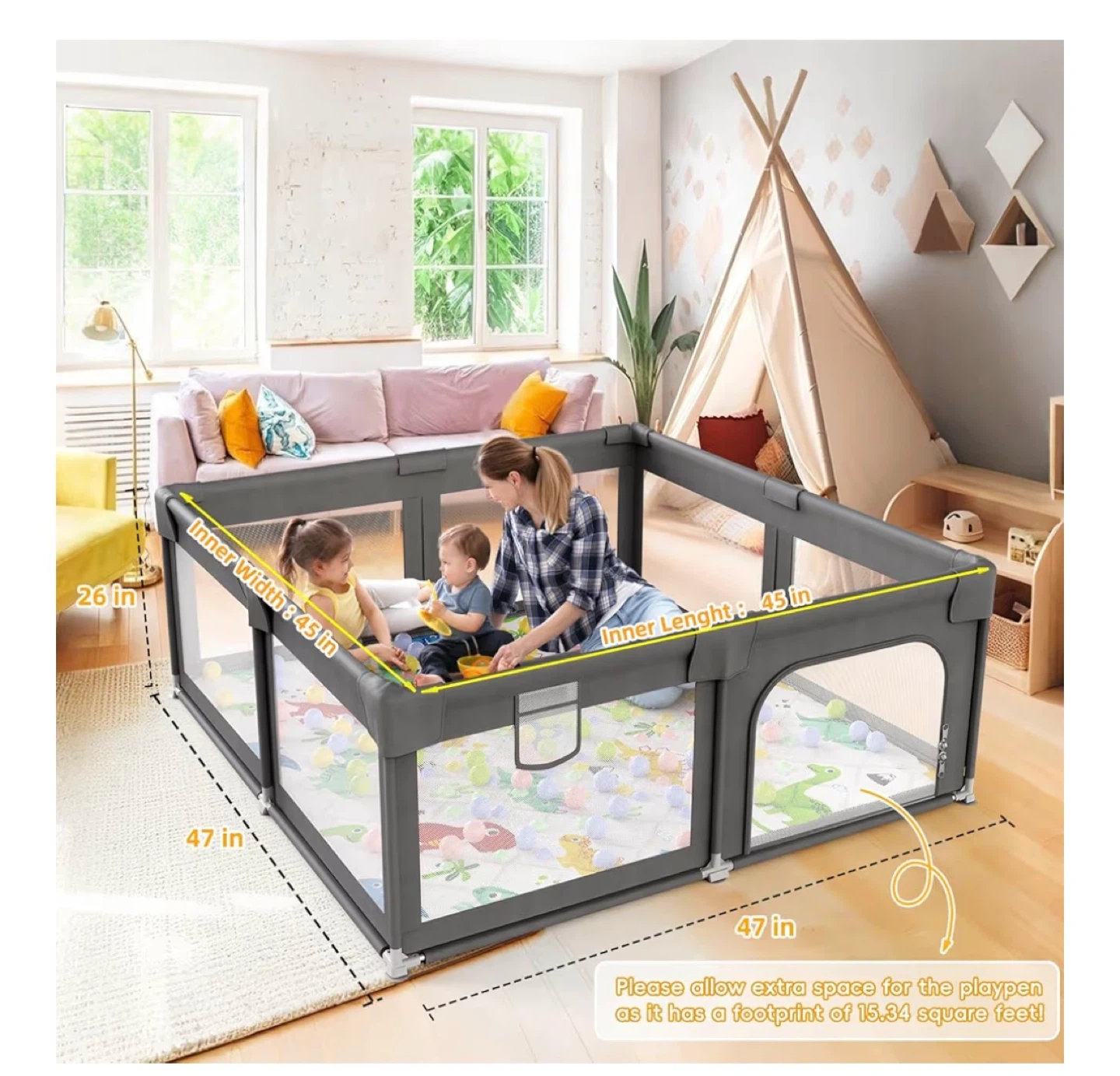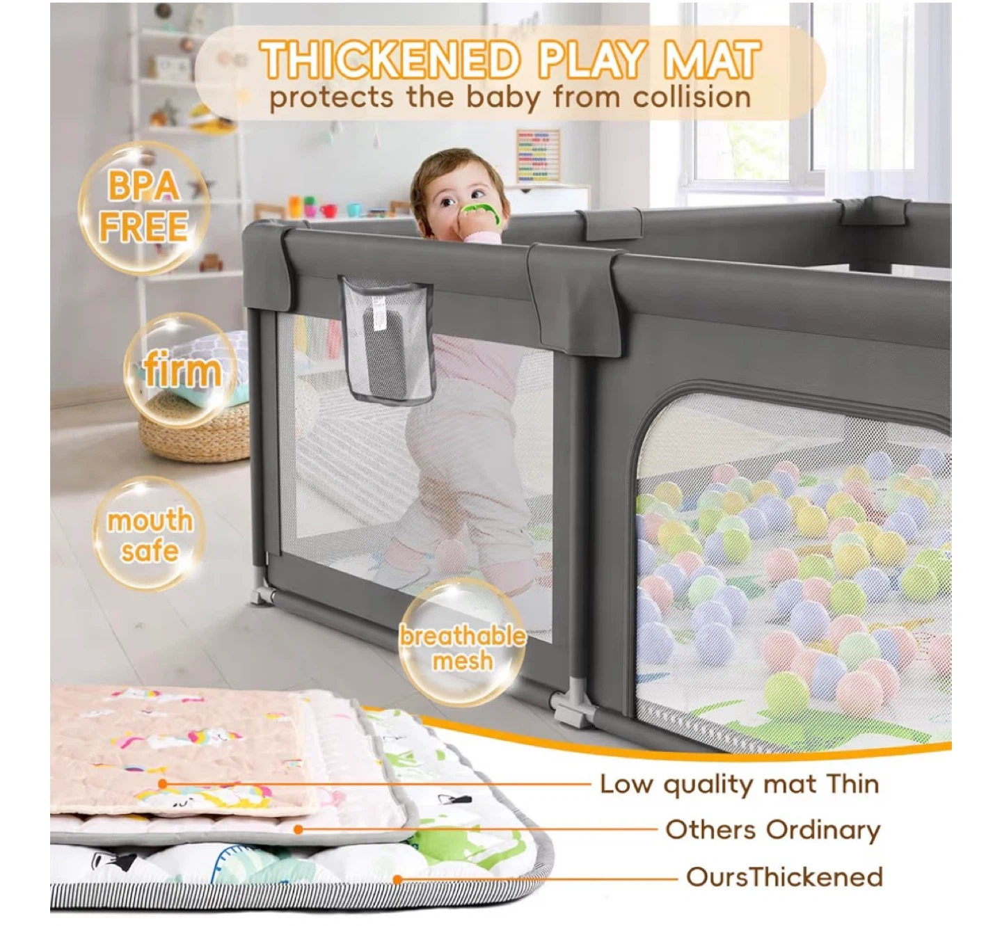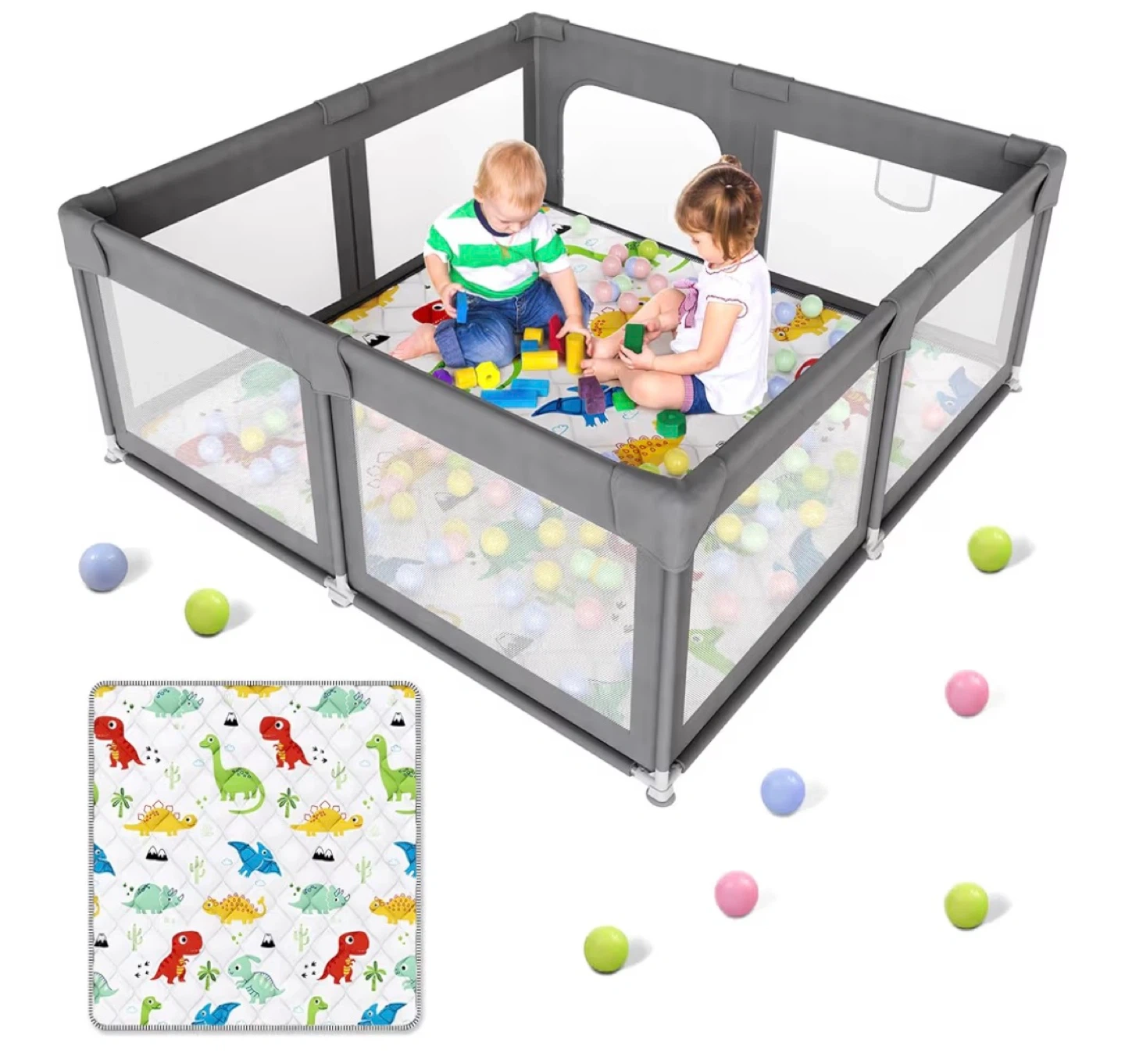 This playpen protects your baby from collisions and is BPA free. It's made with firm, mouth-safe materials and features breathable mesh. Inner width is 64.5 in and inner length is 45 in, with a total footprint of 15.34 square feet. A thickened play mat is included.