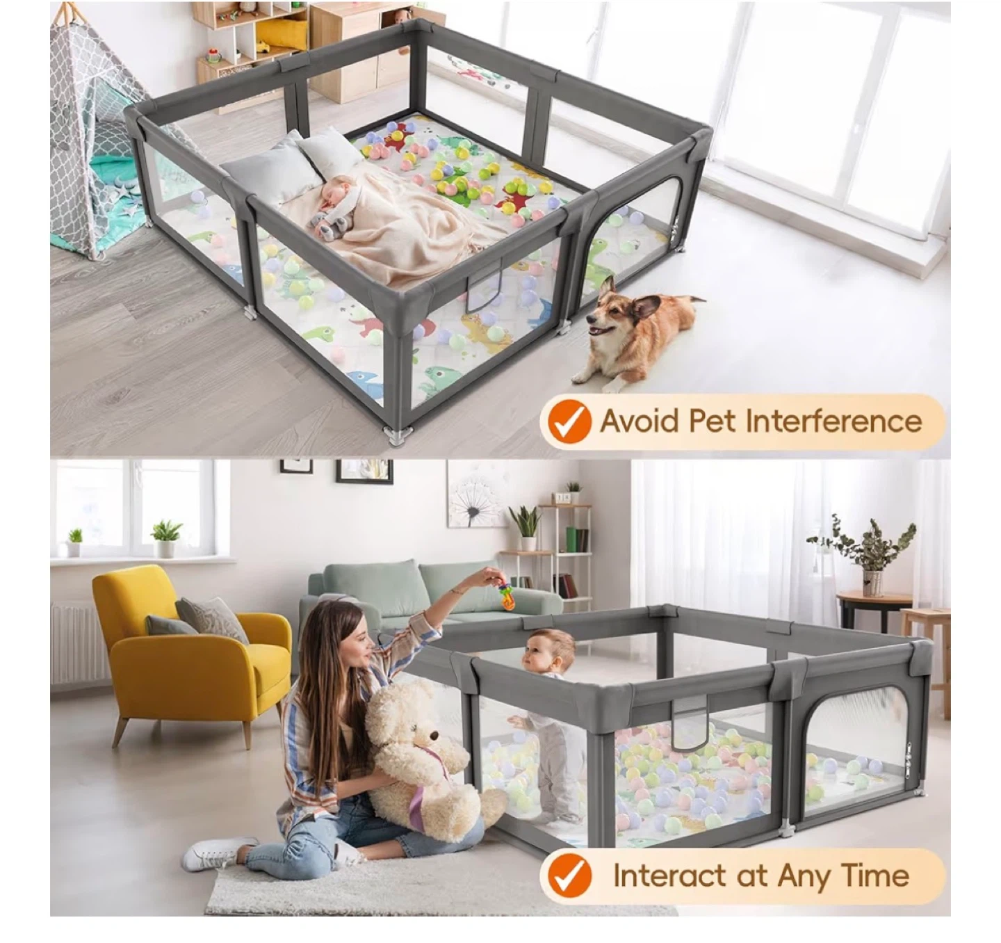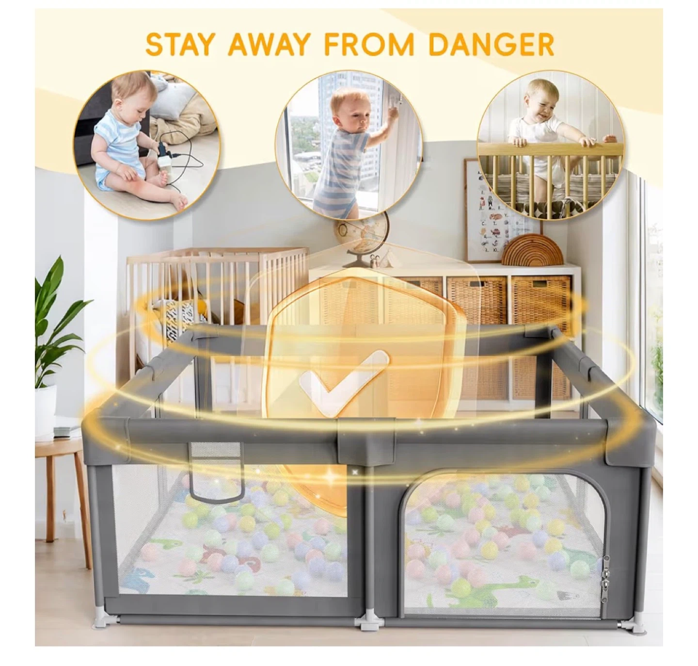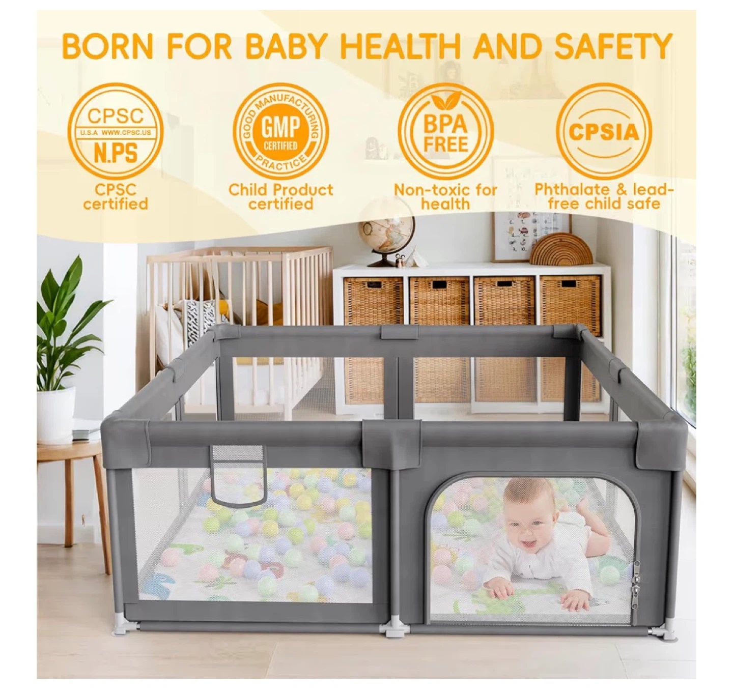 This playpen protects your baby from collisions and is BPA free. It's made with firm, mouth-safe materials and features breathable mesh. Inner width is 64.5 in and inner length is 45 in, with a total footprint of 15.34 square feet. A thickened play mat is included.