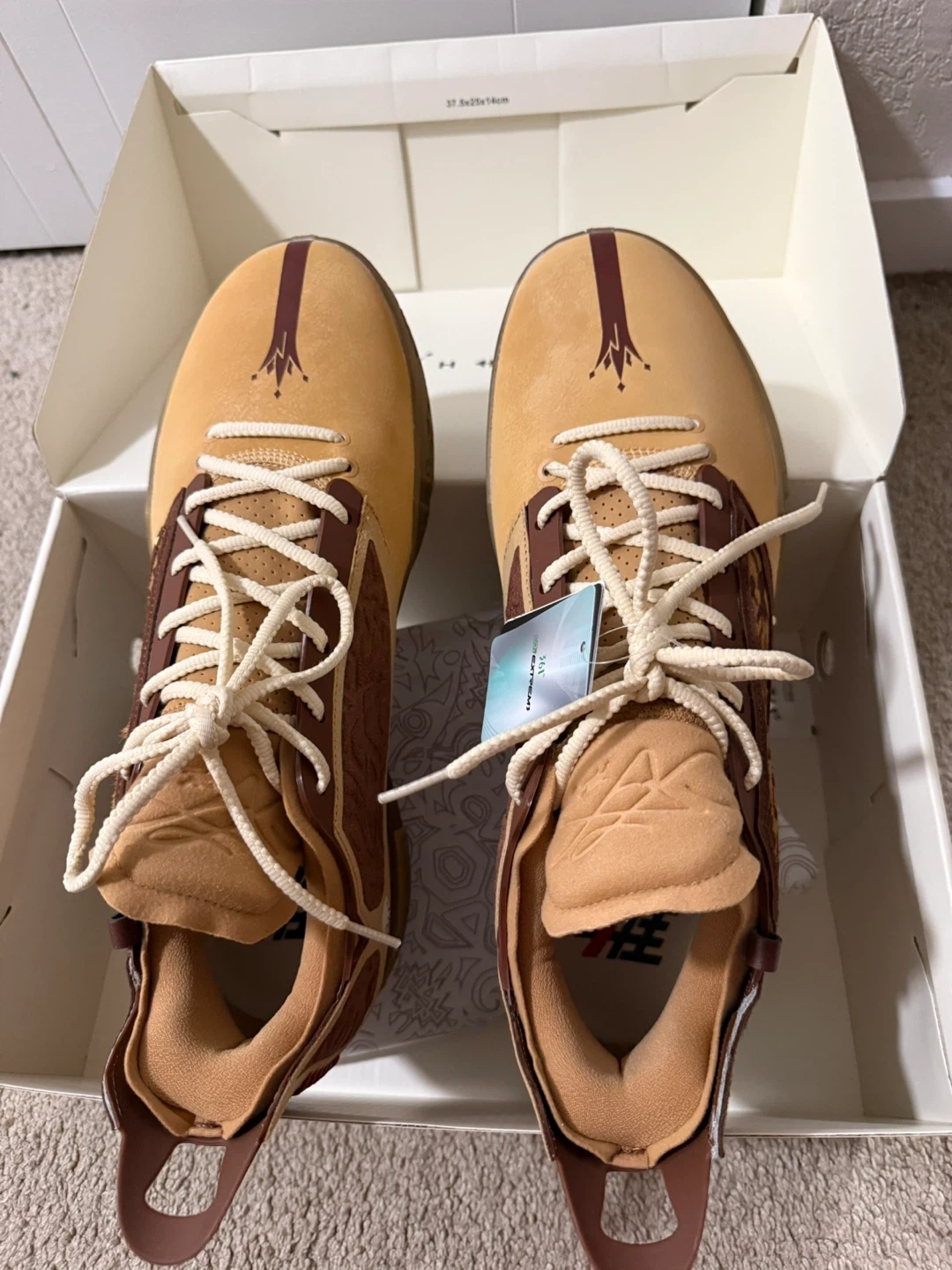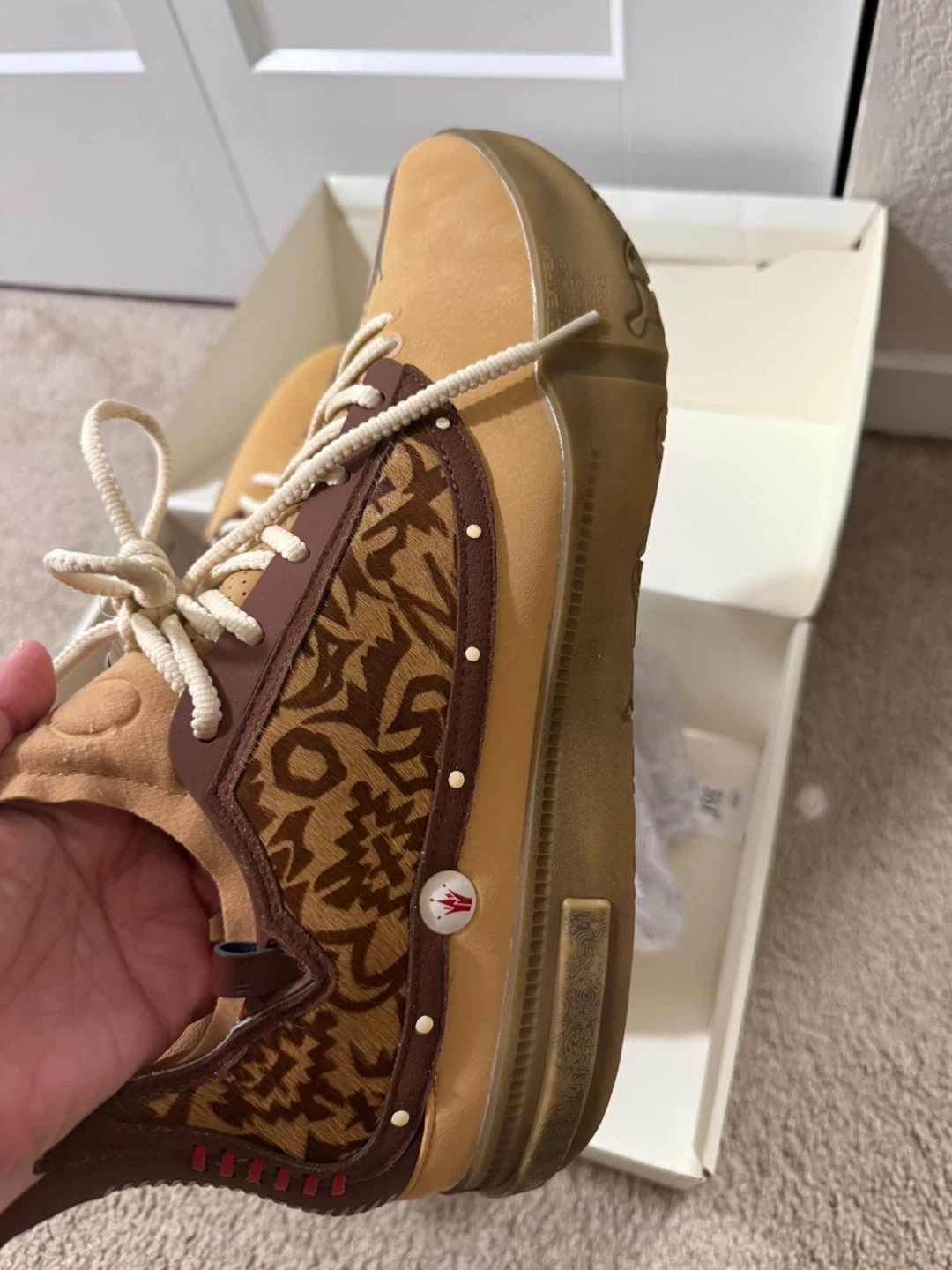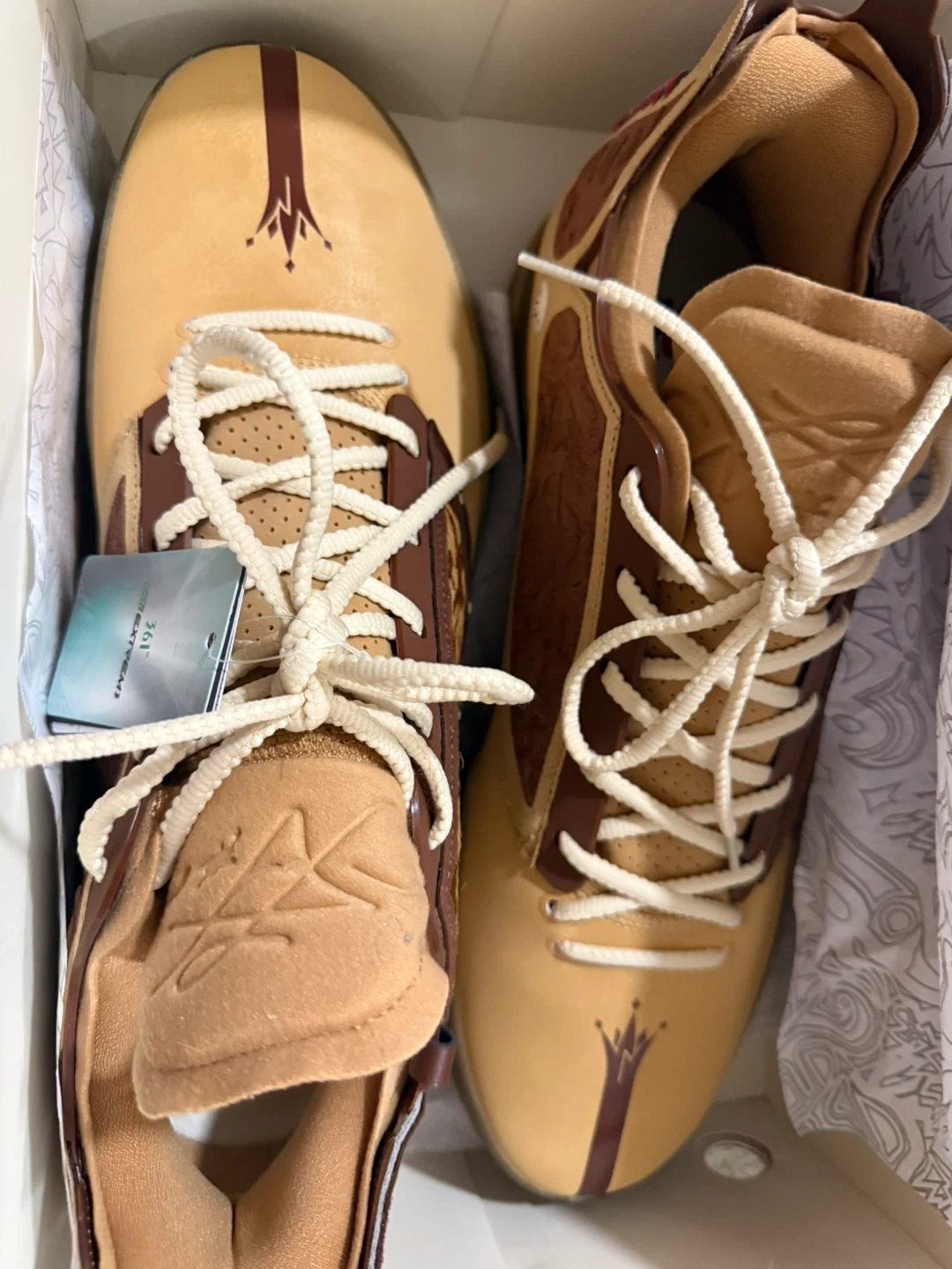 Tan and brown athletic shoes with decorative patterned side panels. Includes original box. Lace-up closure.