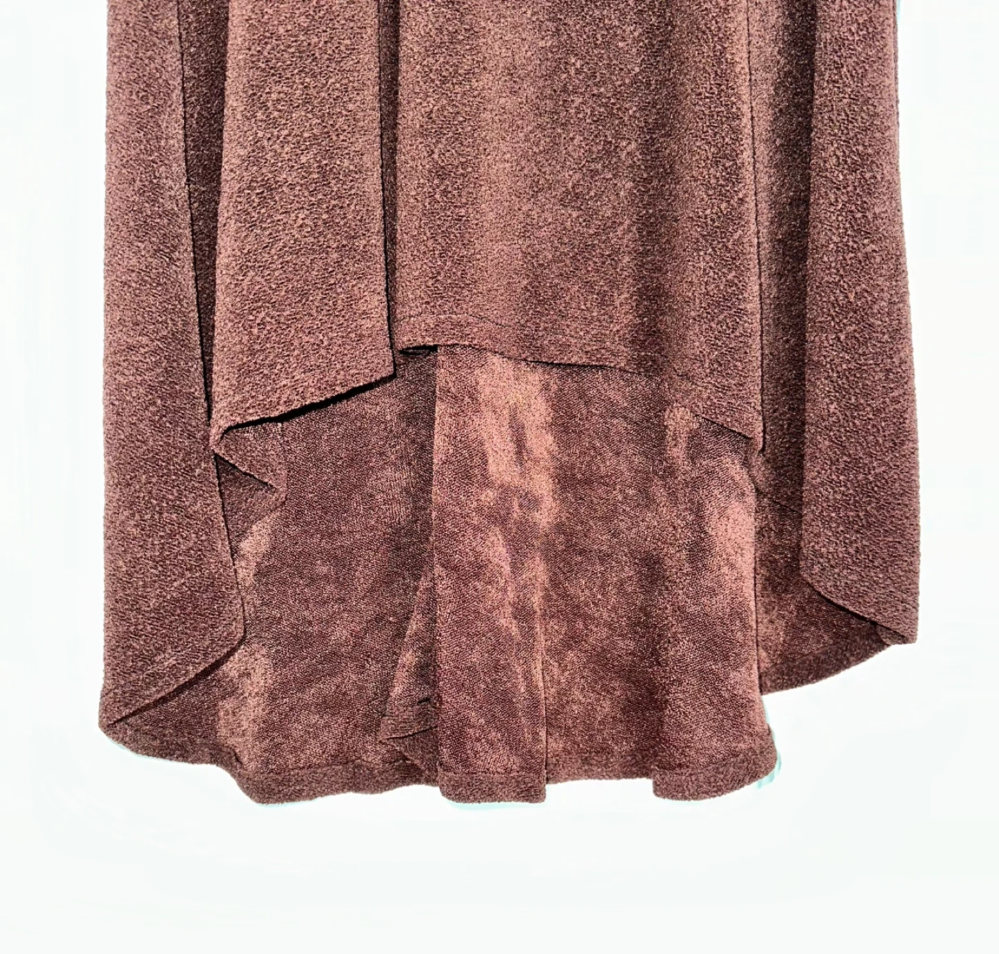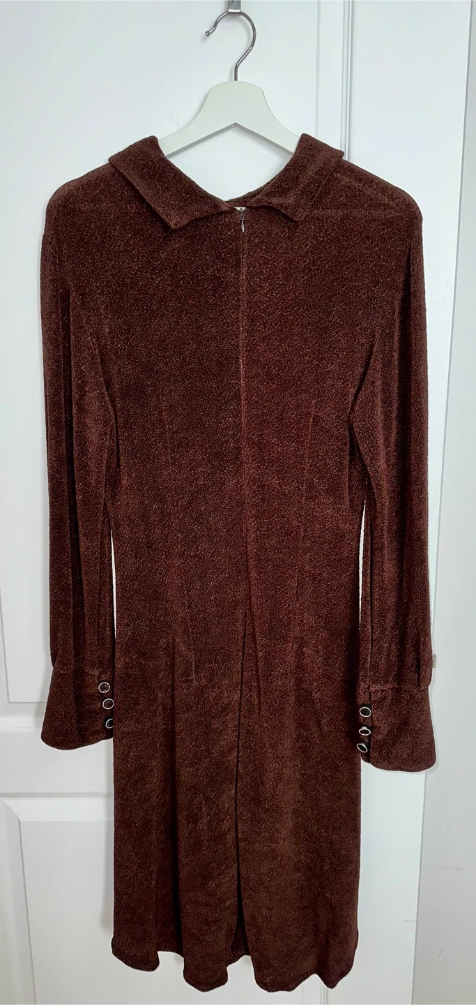 This hand sewn, brown long-sleeve dress features a classic Peter Pan collar and elegant pleating detail on the bodice. It has decorative buttons on the cuffs and a flowing, layered hemline. The fabric has a subtle metallic sheen, making it a lovely choice for many occasions.