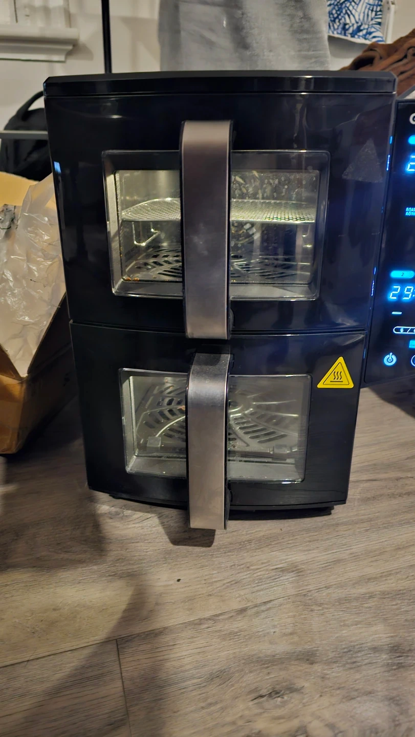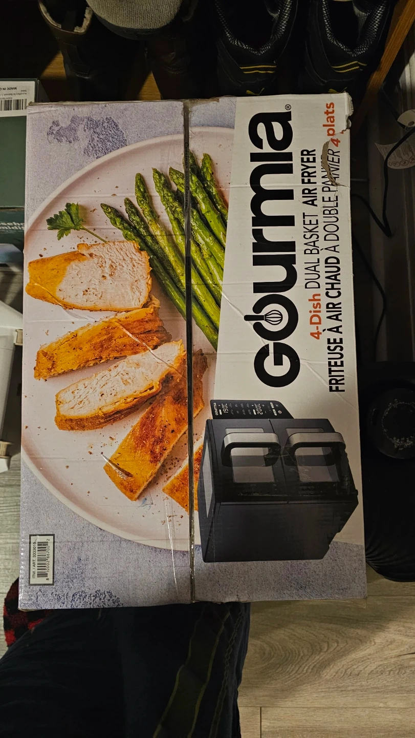 Gourmia 4-Dish Dual Basket Air Fryer. It's a 4-quart capacity unit. This air fryer comes with two baskets for cooking multiple foods at once. It's great for families or entertaining guests!