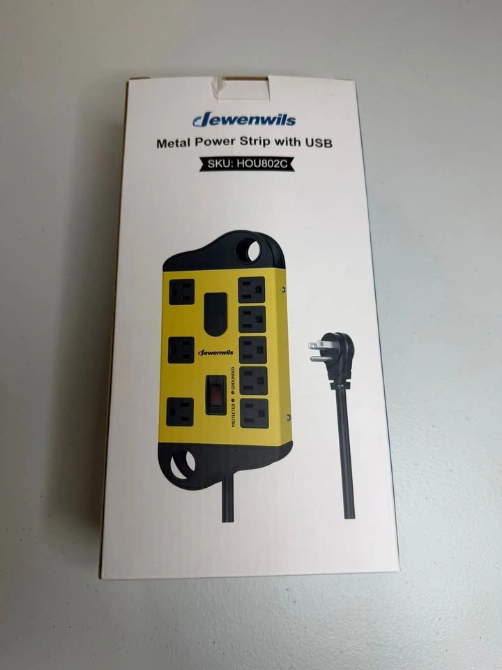 DEWENWILS Garage Power Strip Wall Mount with 8 outlets and 2 USB ports. Features wide spacing, a metal surge protector (1440J), and a heavy-duty 14AWG, 6ft extension cord. Great for garages and workshops. Yellow color.