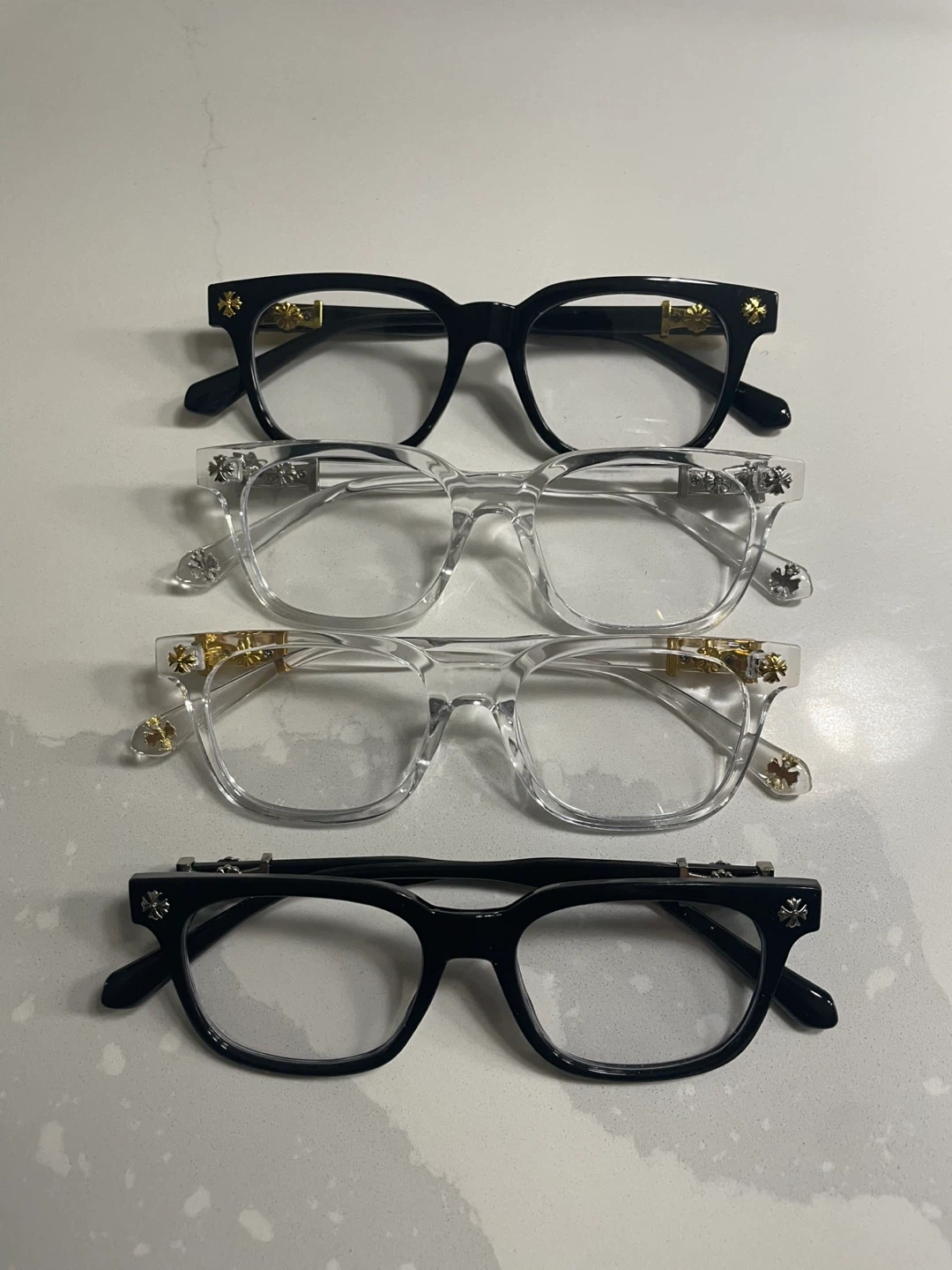 Set of four eyeglasses frames with gold accents. Two black frames and two clear frames. These frames have the distinctive Chrome Hearts cross detail. Perfect for someone looking to customize their own lenses!
