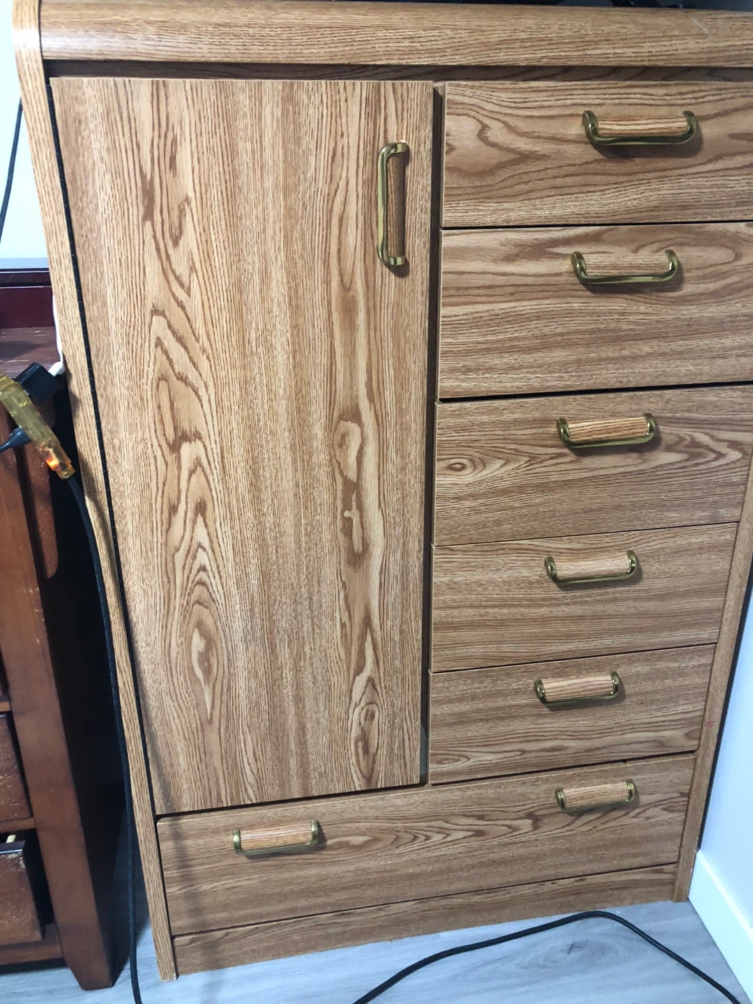 This is a light wood finish wardrobe with 6 drawers. It has a single door on the left side and 5 drawers on the right 1 on the bottom. The handles are made of brass