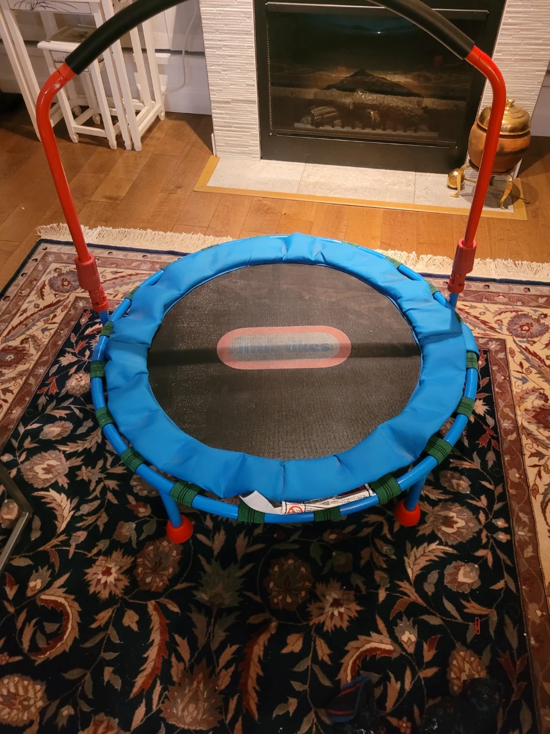 Little Tikes trampoline for indoor or outdoor fun! It's blue with a sturdy red handlebar for stability. Great for little ones to burn energy!