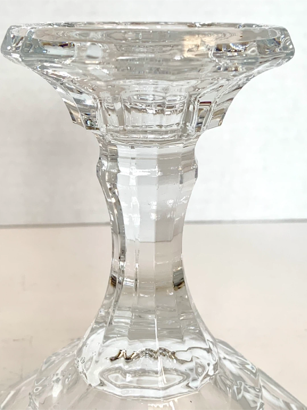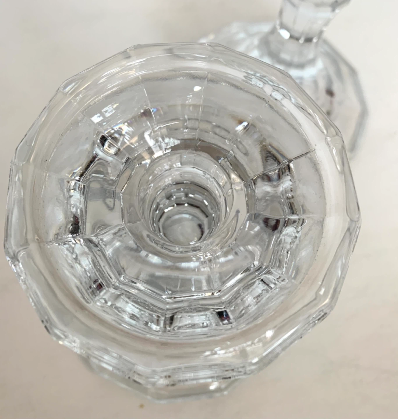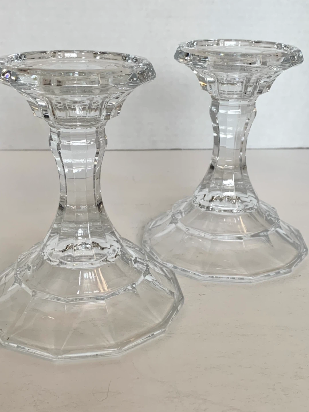 This is a set of two clear glass candlesticks. They have a faceted design on the base and stem. Made of glass.