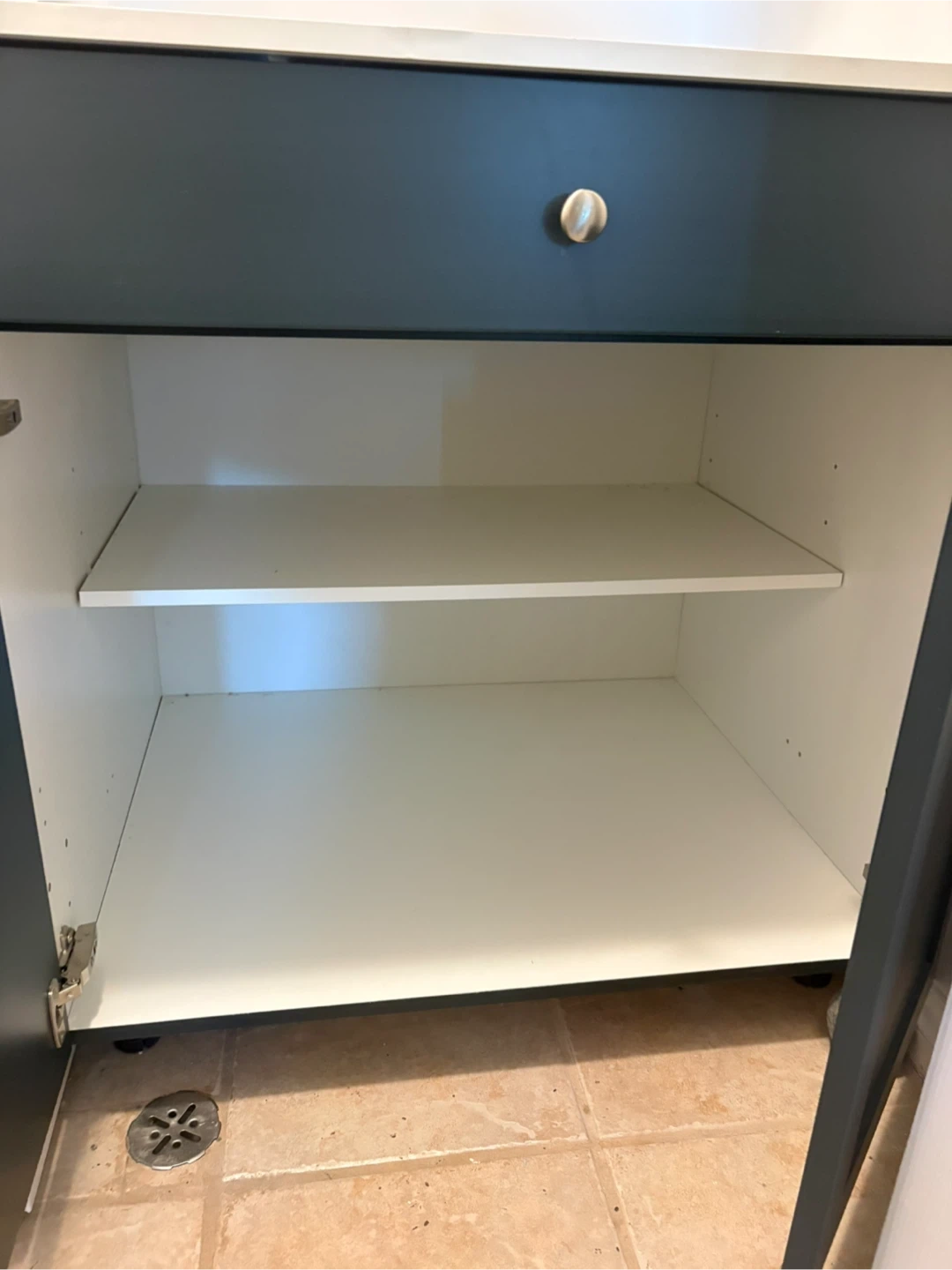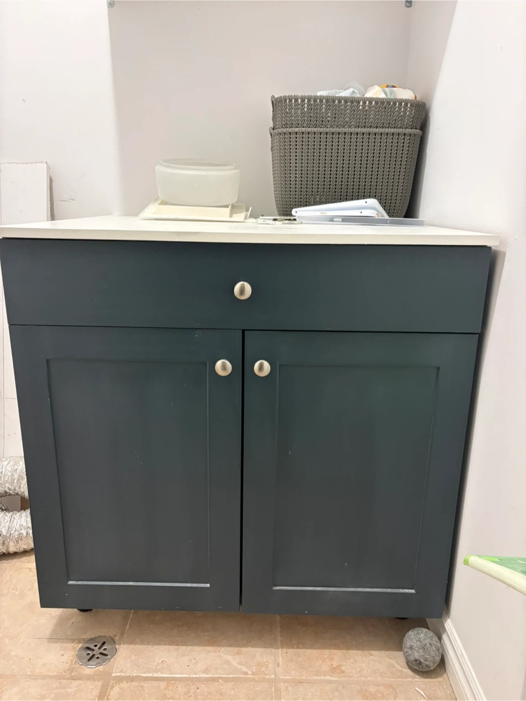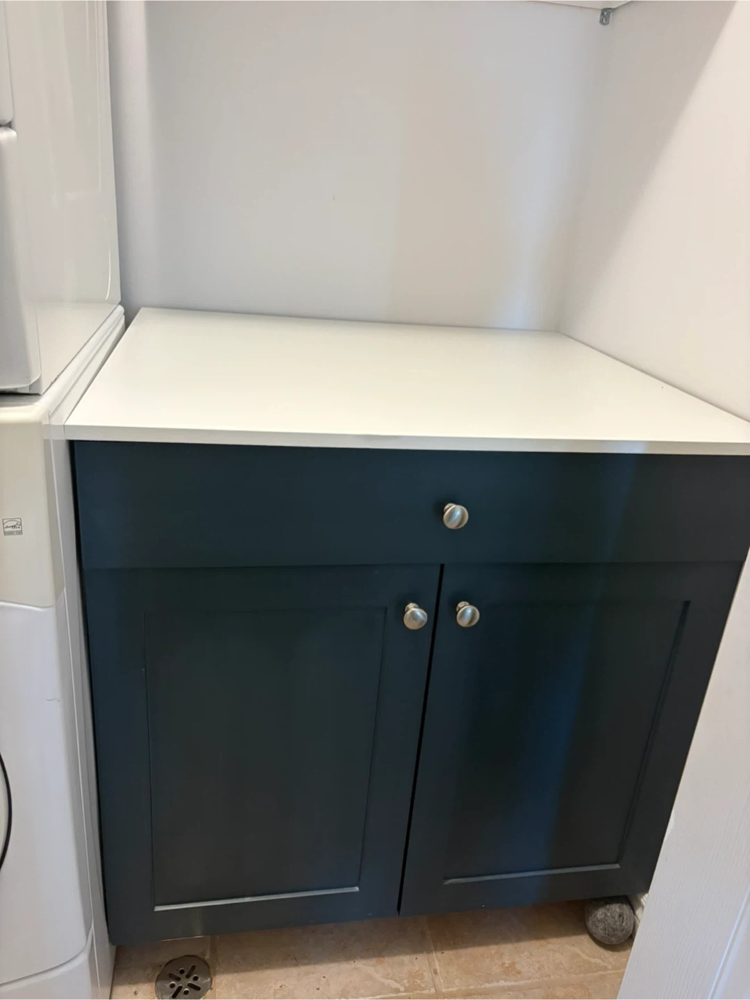 Two-door cabinet with one drawer. White countertop. Features two shelves inside for storage. Great for organizing a laundry room or small bathroom!