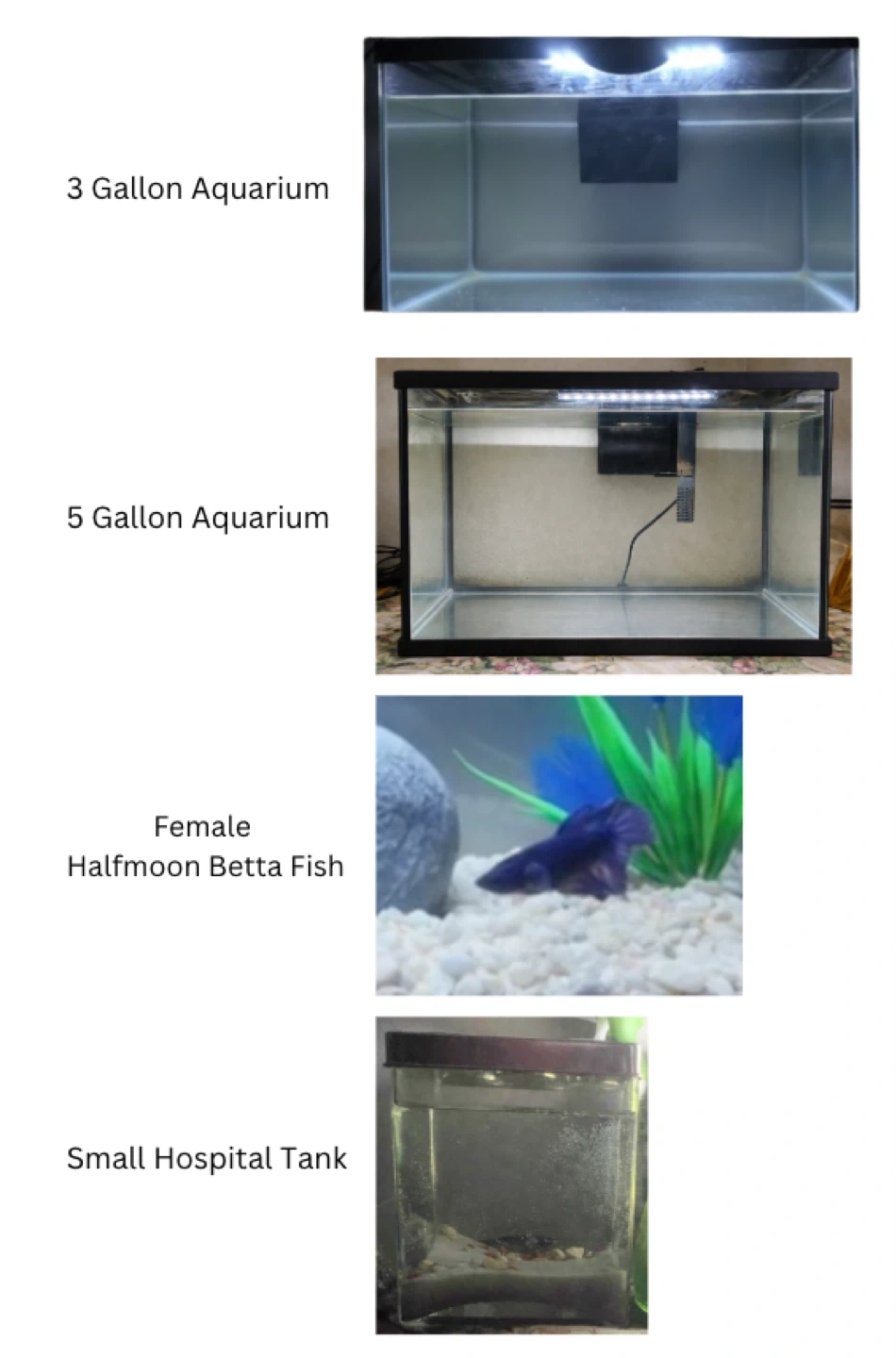 2 Fish Tanks with Filters, Lids and Lights, 1 Betta fish, 1 Hospital Tank, Blue and White gravel mix.