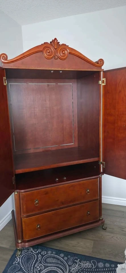 Classic Bombay Company Armoire with 2 drawers. This piece measures 23” deep x 36” wide x 76” tall. Cash only. Must pickup. Can be disassembled in two pieces.
