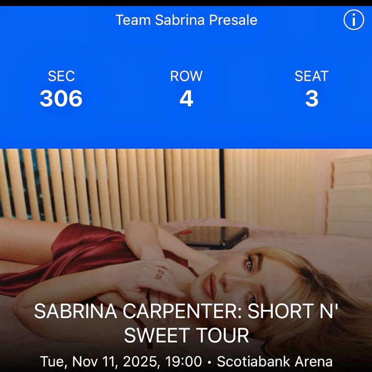 10I have two ticket for Sabrina Carpenter's Short N' Sweet Tour. It's for the show on Tue, Nov 11, 2025, 19:00 at Scotiabank Arena. Details: - Section: 306 - Row: 4 - Seat: 3 and 4