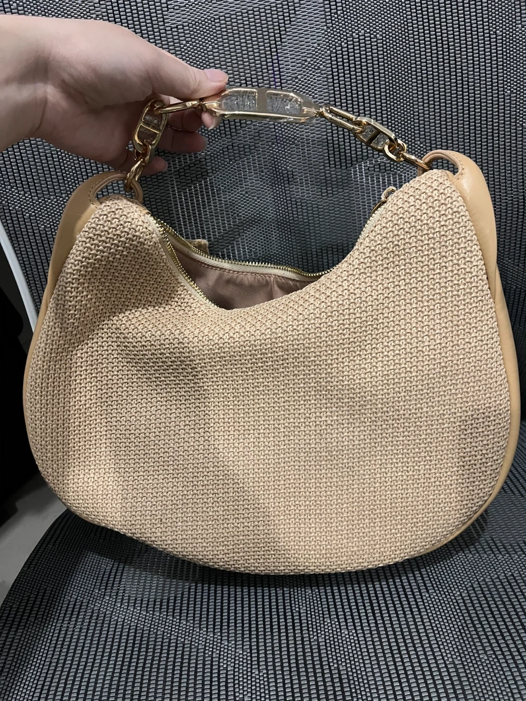 60Joli sac à main de couleur beige avec une chaîne dorée. Il est en très bon état et prêt à vous accompagner dans vos sorties! Le sac est parfait pour celles qui aiment un style classique et élégant