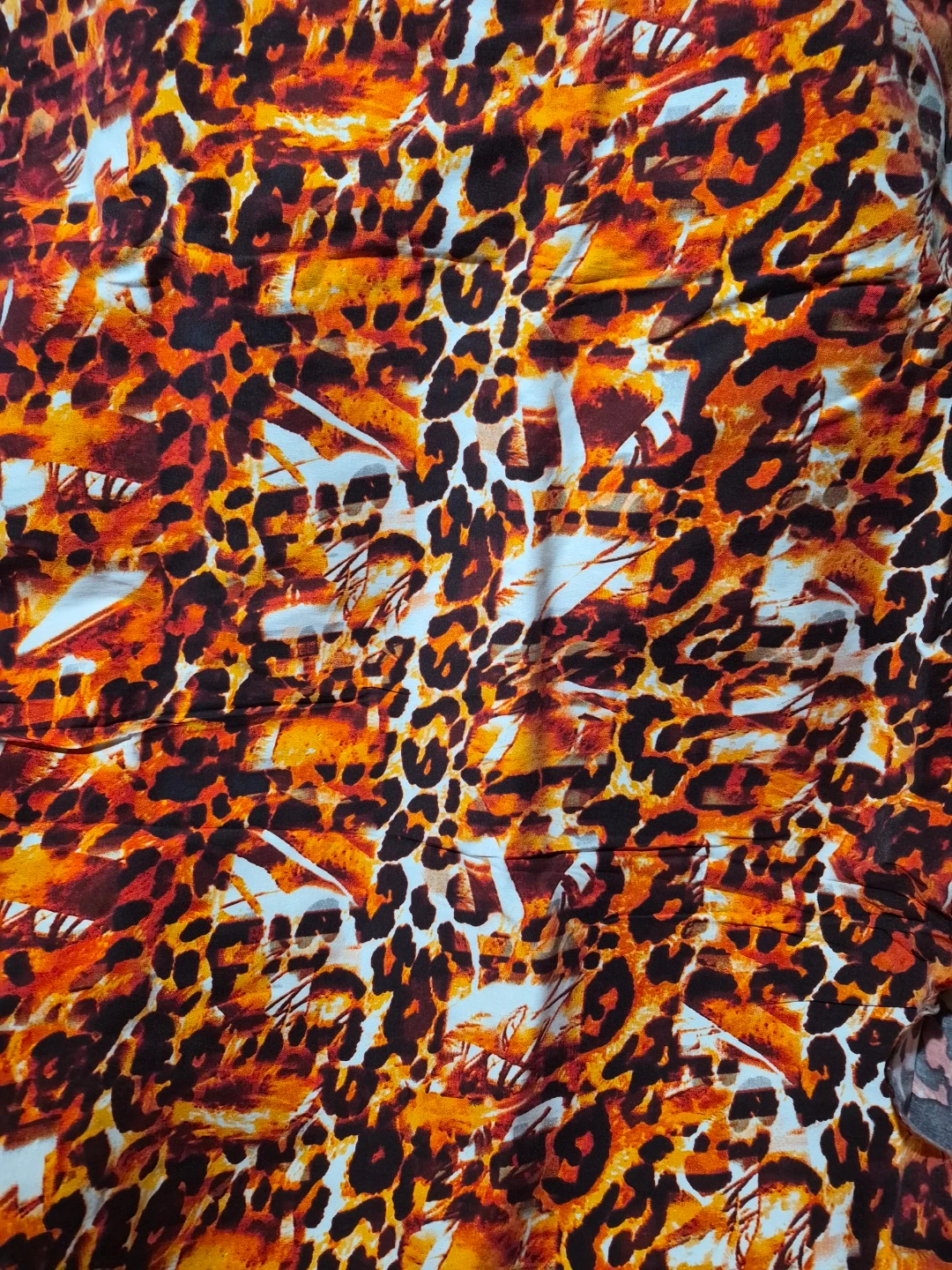 Fabric panel featuring a vibrant leopard print design. The pattern includes shades of orange, brown, black, and white. Material appears to be polyester blend, with a slight sheen. Could be used for crafts or small sewing projects. 60 x 106 inches roughly.
