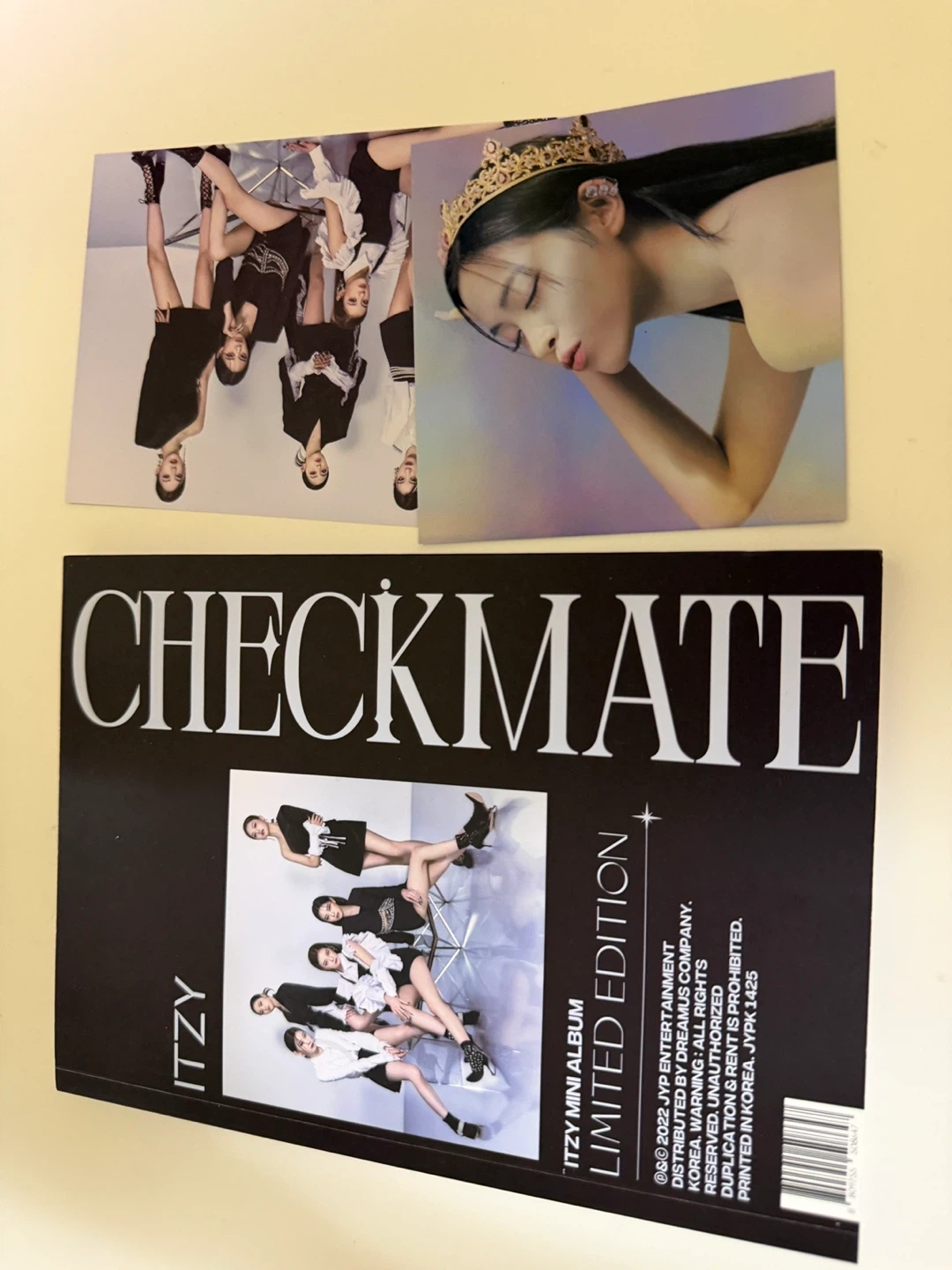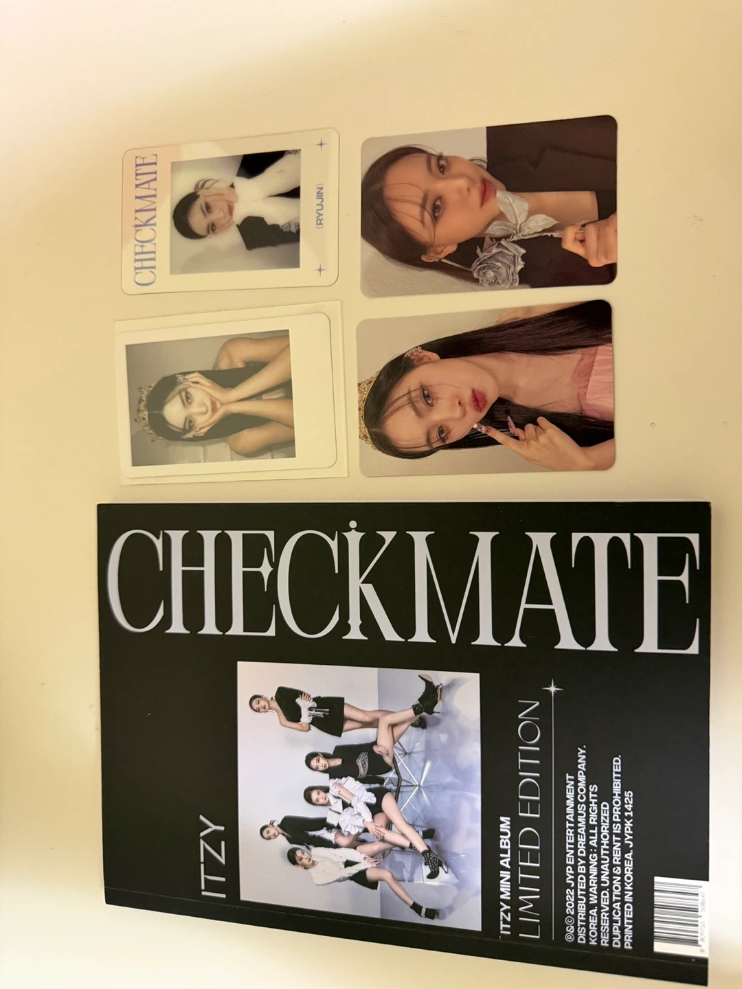 Selling the limited edition 'CHECKMATE' mini album by ITZY. It includes photocards and other inclusions shown in the photo.