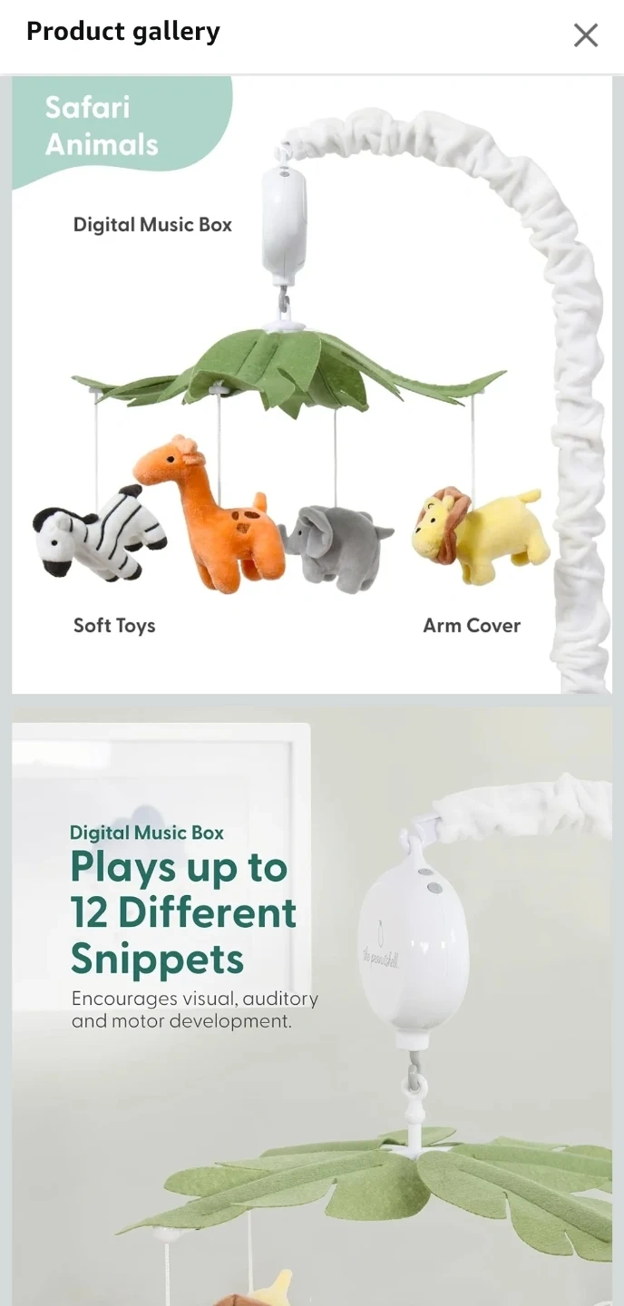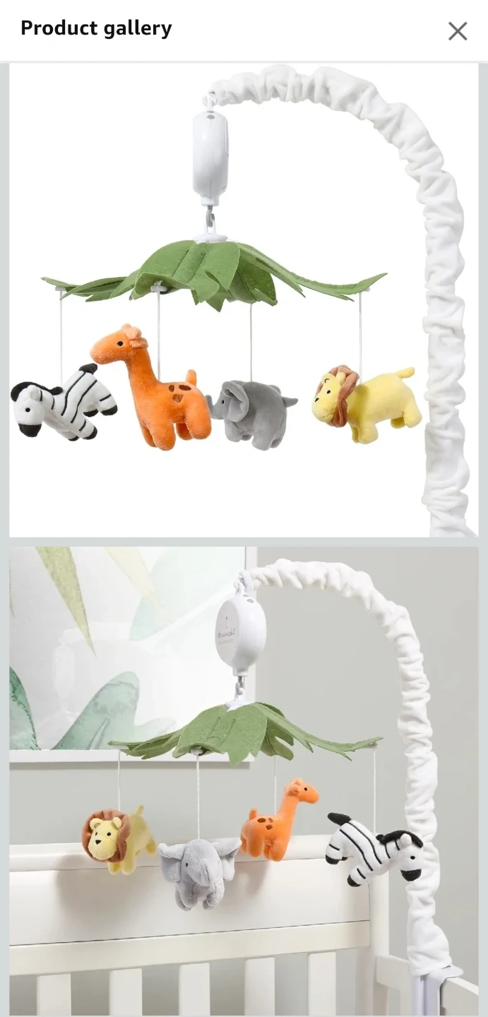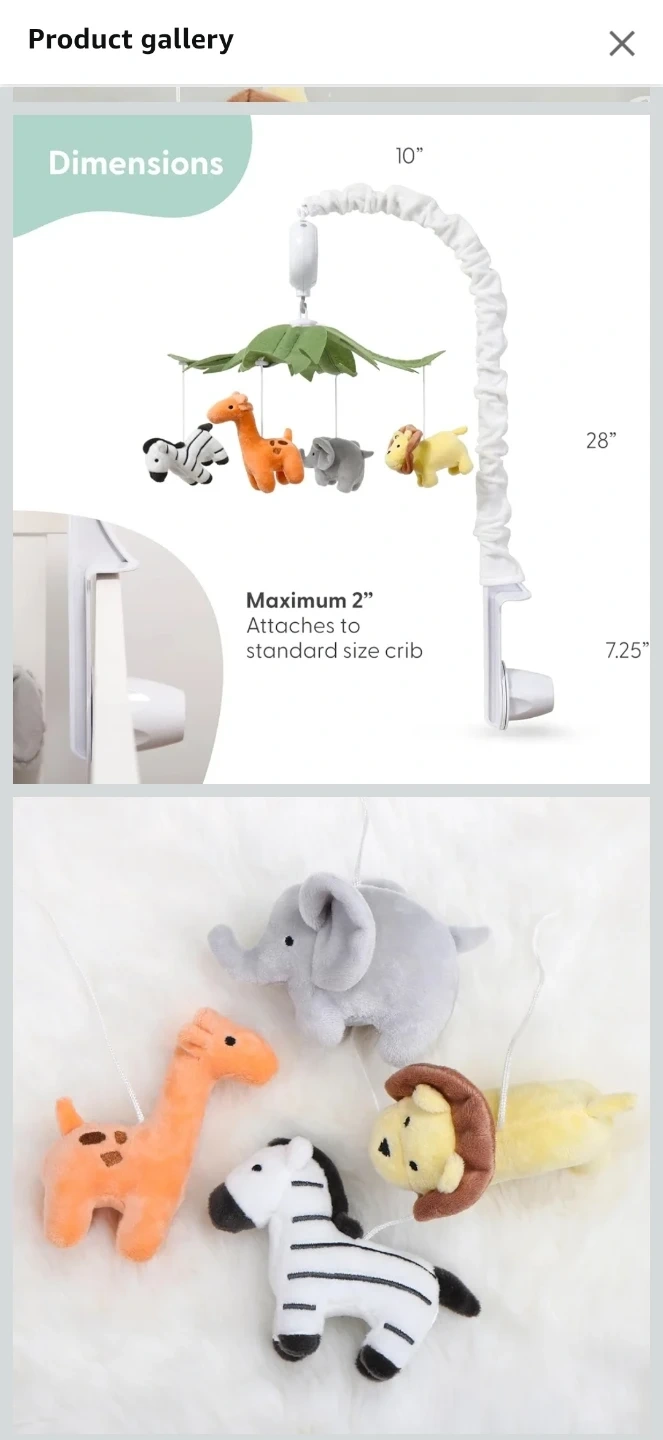 21This adorable safari animals crib mobile is perfect for your little one! It features a digital music box that plays up to 12 different snippets to encourage visual, auditory, and motor development. The mobile attaches to a standard size crib and includes soft toys of a zebra, giraffe, elephant, and lion. Dimensions are 10" x 28" with a maximum 2" attachment.