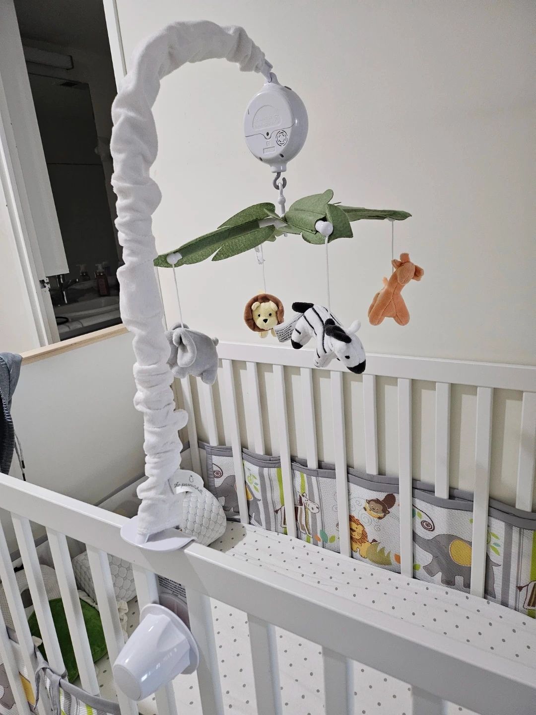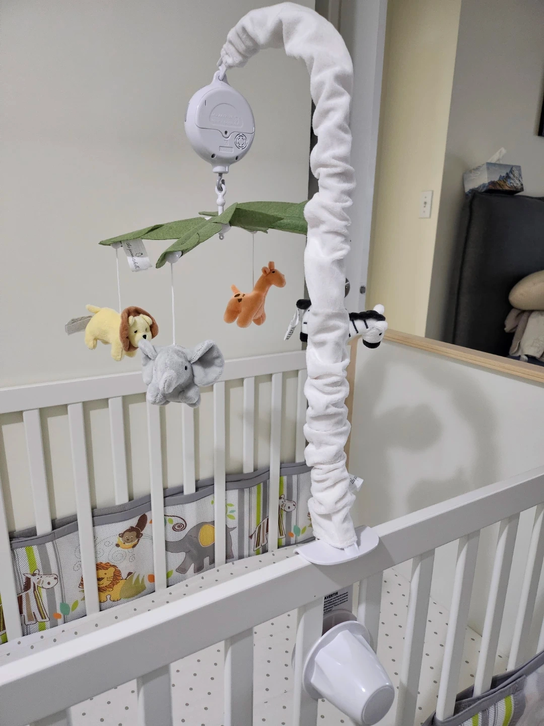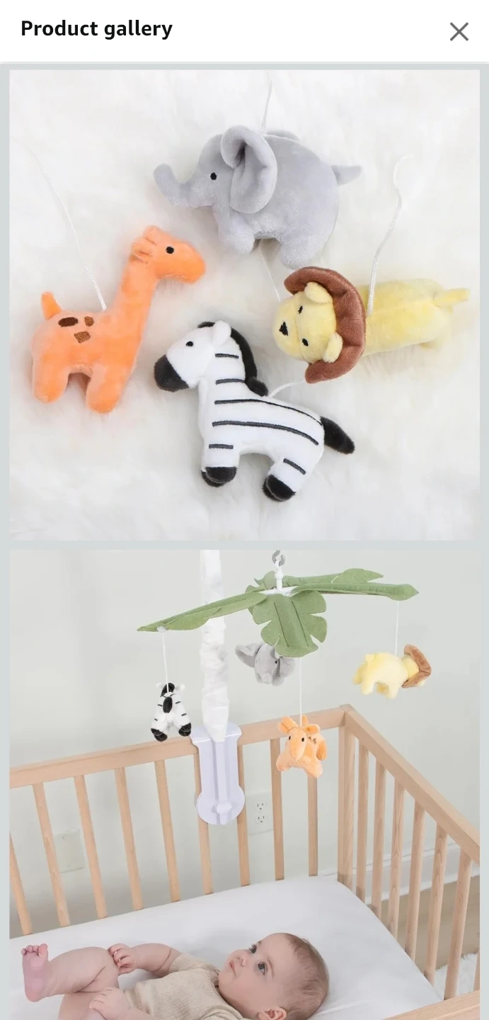 21This adorable safari animals crib mobile is perfect for your little one! It features a digital music box that plays up to 12 different snippets to encourage visual, auditory, and motor development. The mobile attaches to a standard size crib and includes soft toys of a zebra, giraffe, elephant, and lion. Dimensions are 10" x 28" with a maximum 2" attachment.