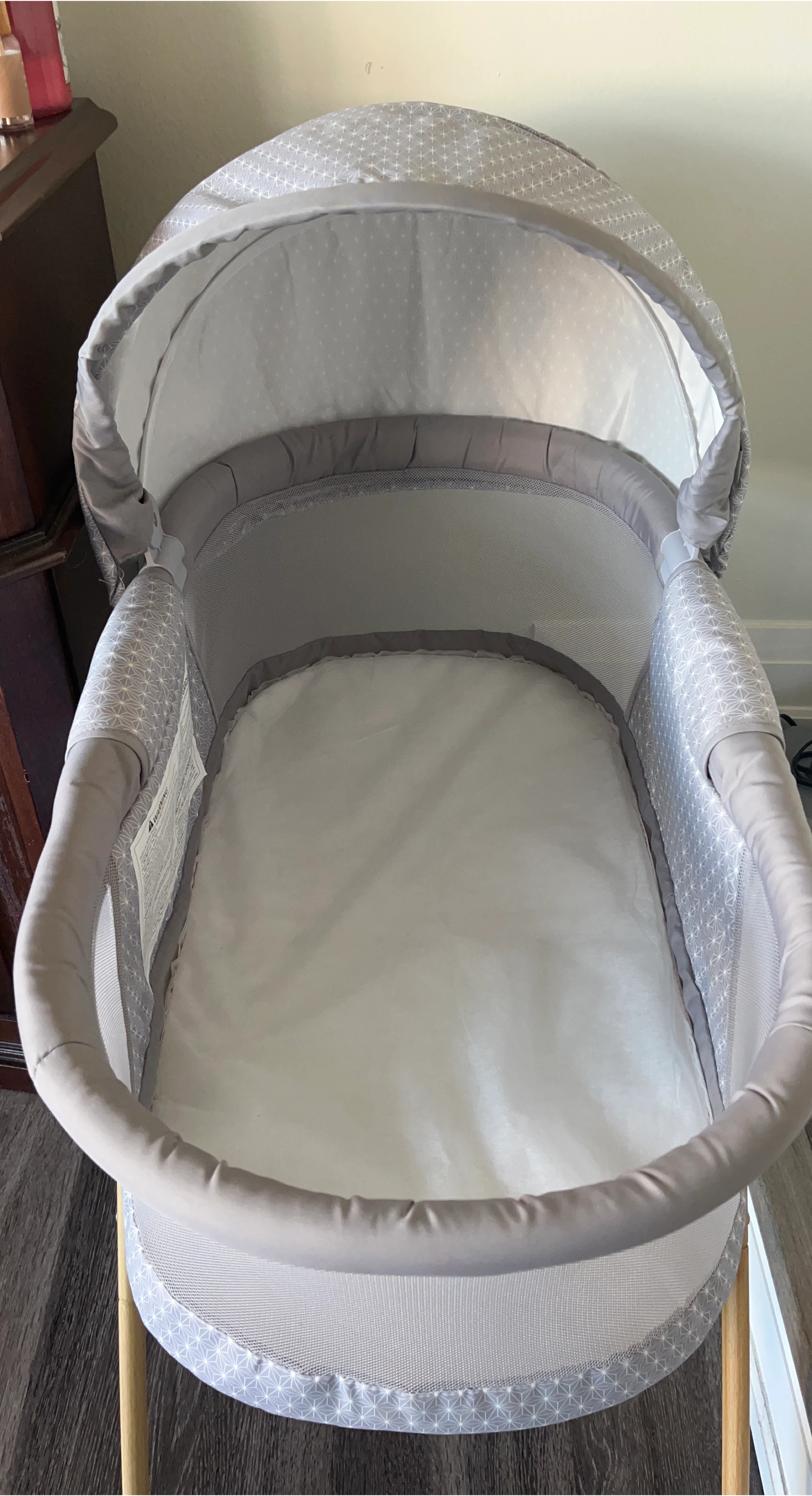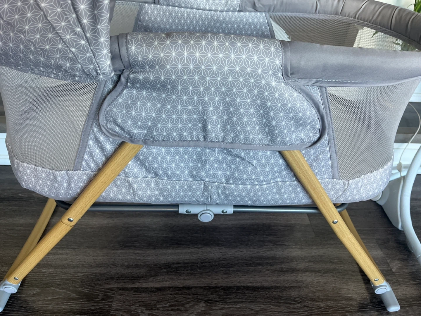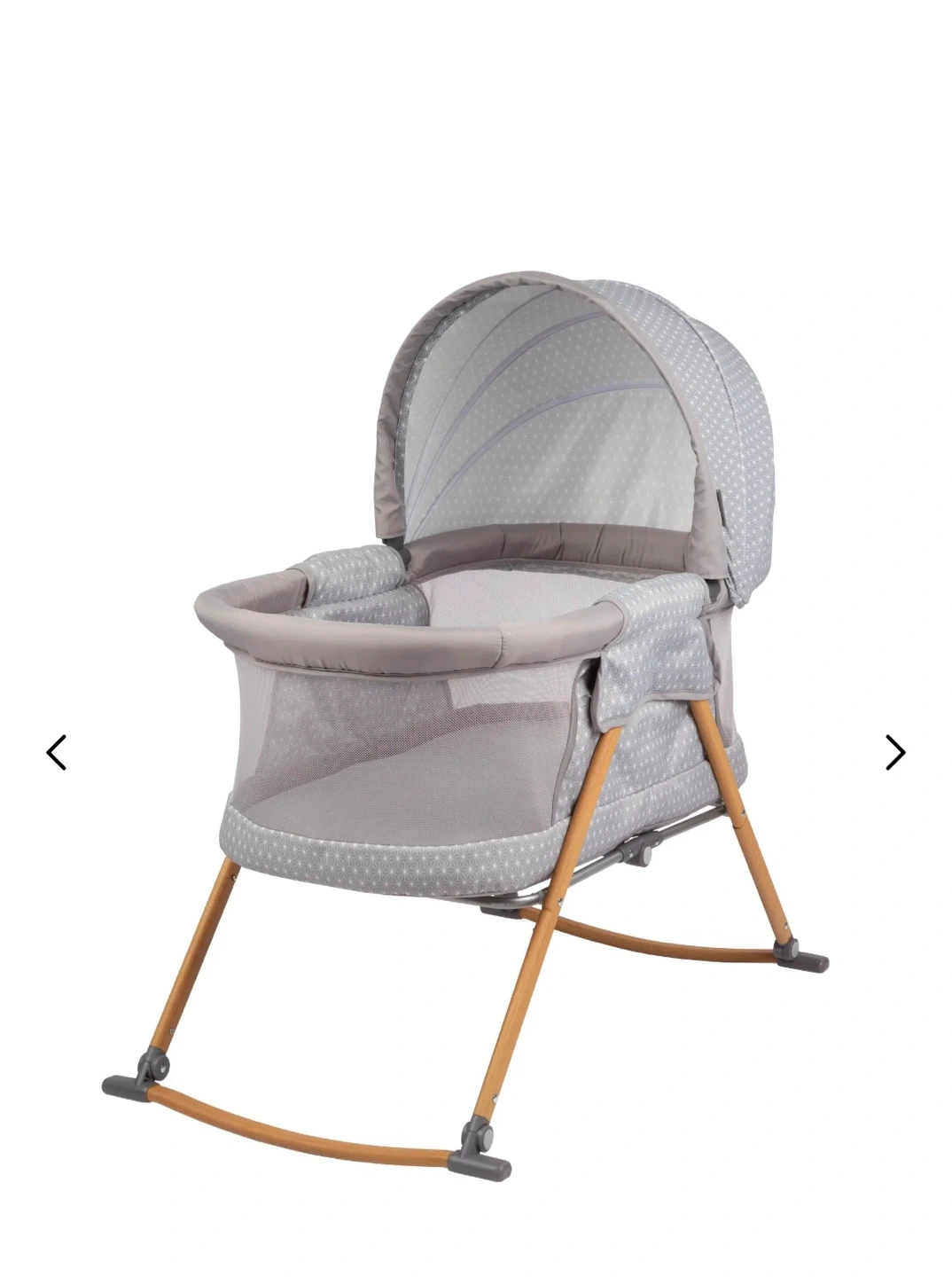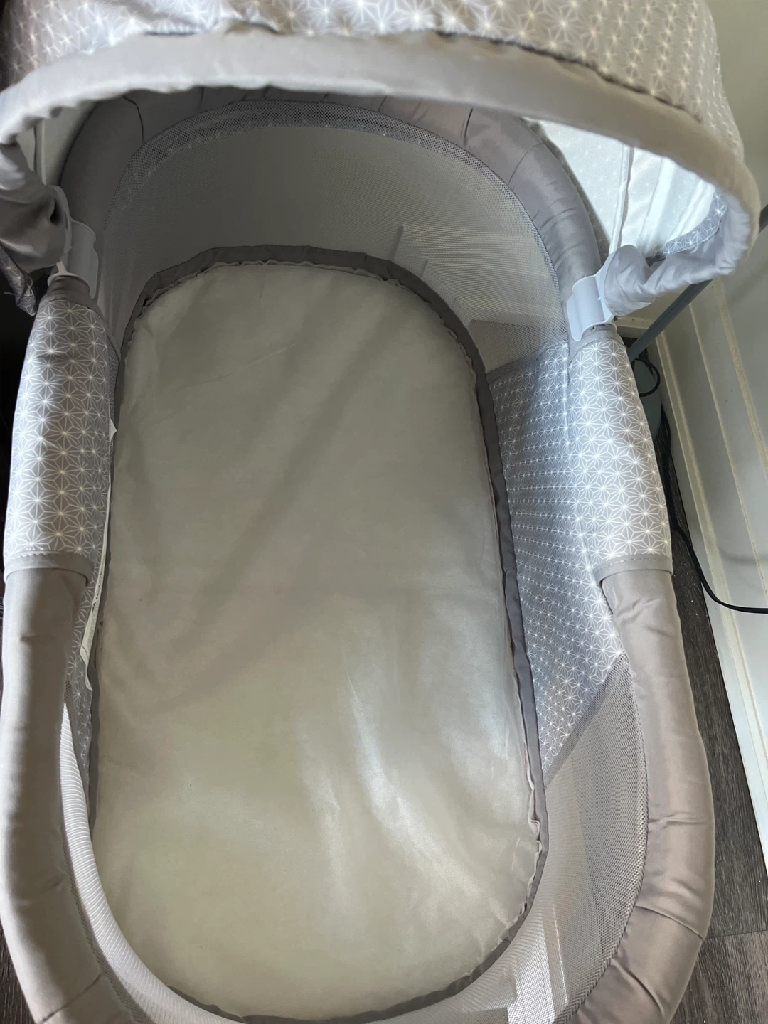 21Selling a bassinet. It features a grey and white patterned design and a sturdy frame. Perfect for newborns and infants! Its features are: 1. Compact design 2. Canopy for sunshade with the option to be removed completely. 3. Hand Rocking mode to gently lull baby to sleep. 4. Breathability - provide optimal air exchange and the ability to easily monitor your baby from all 4 sides.