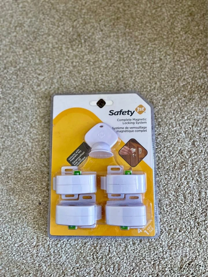 Four magnetic locks and one magnetic key. Complete locking system for cabinets and drawers. New. Unopened package.