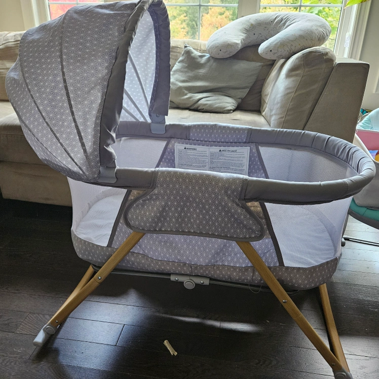 60Selling a baby bassinet in great condition! It's a neutral grey colour and would be perfect for a new baby. The bassinet is lightweight and portable, making it easy to move from room to room.