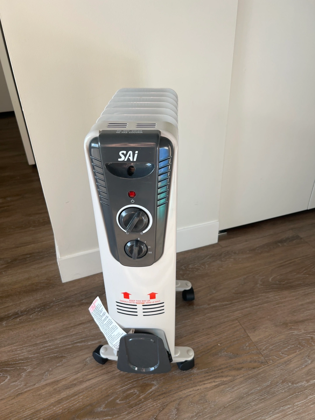 47This is a white and grey oil-filled radiator heater from the brand SAI. It features adjustable heat settings, wheels for easy movement, and a safety tip-over switch. It has a power cord and plug.