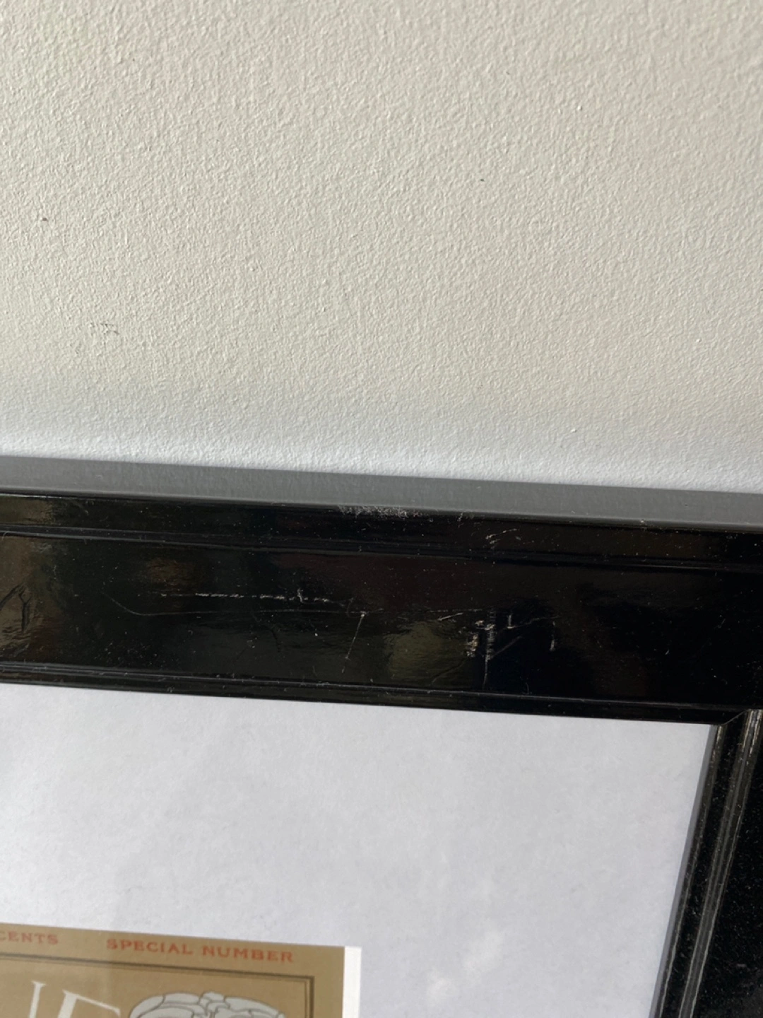 Classic print displayed in a black frame. The art piece features a vintage Vogue cover. A great item to hang to complete a room's decor, evoking a sense of style and elegance. Second frame has a scratch on top and bottom.