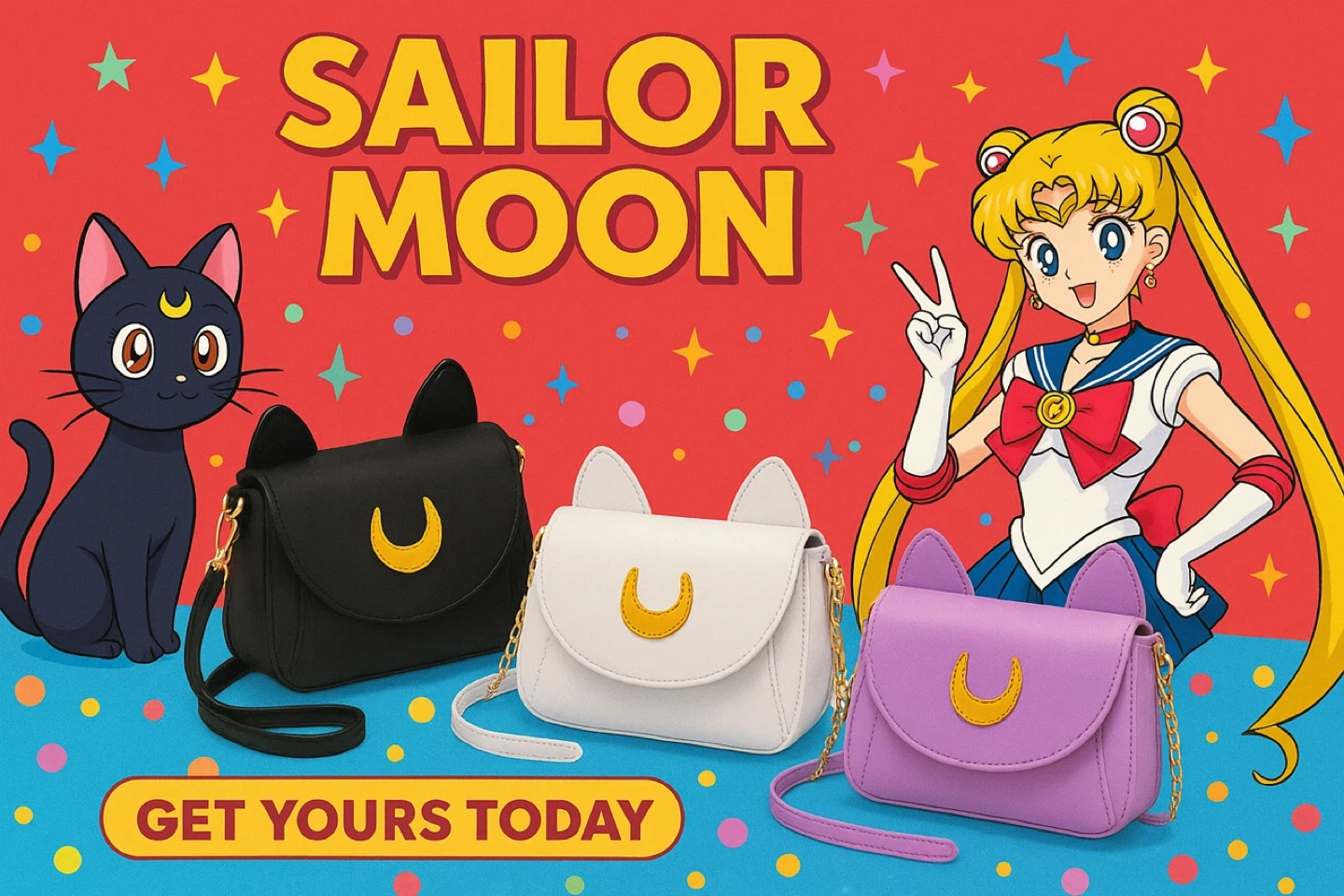 Super cute Sailor Moon themed shoulder bag with cat ears and a crescent moon design! Available in black, white, and purple. Perfect for any Sailor Moon fan!