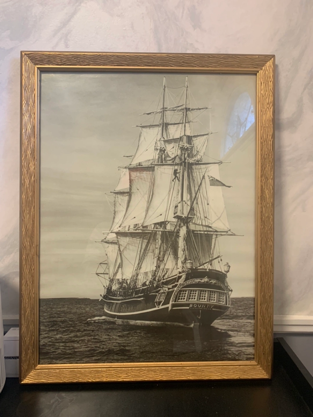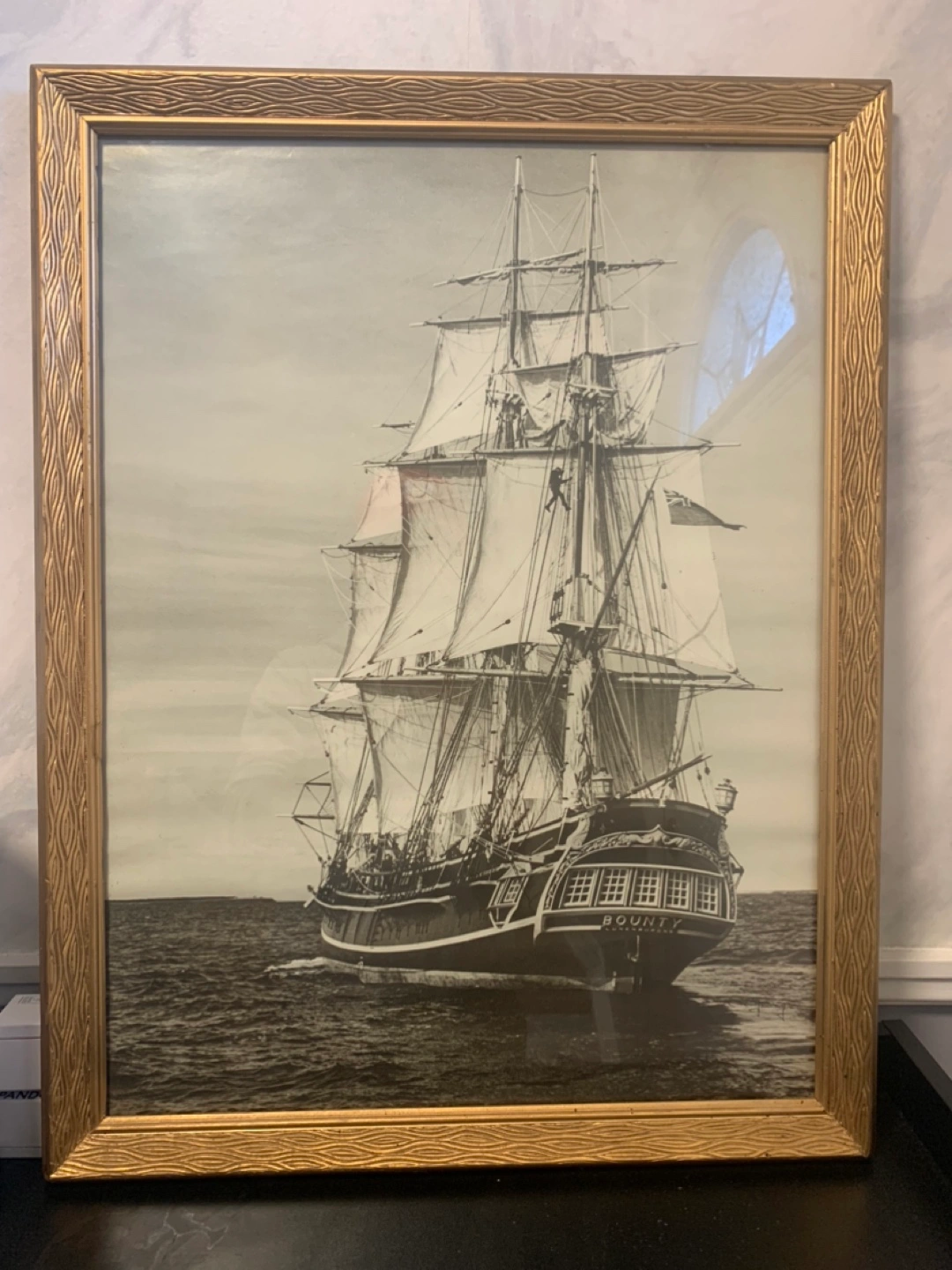 Black N white framed Sailship “bounty”!! Size H 26 inches and W 20 inches..