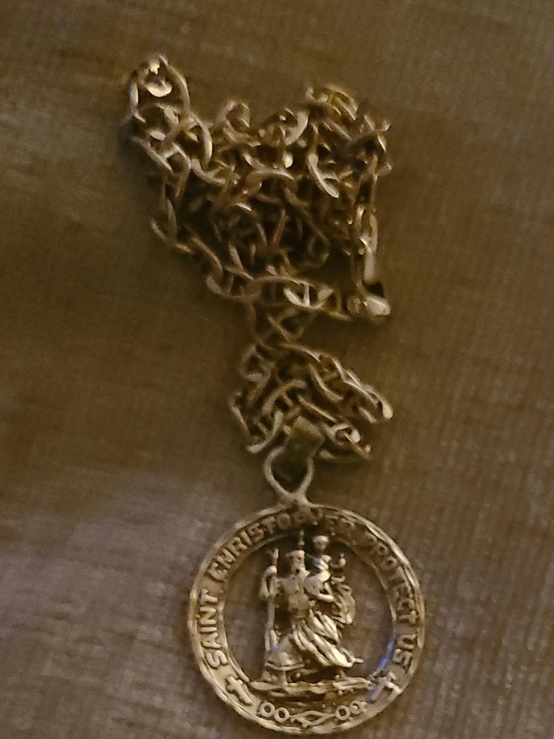 10Selling a Saint Christopher necklace. The pendant says 'Saint Christopher Protect Us'. It's in great condition and ready for a new home